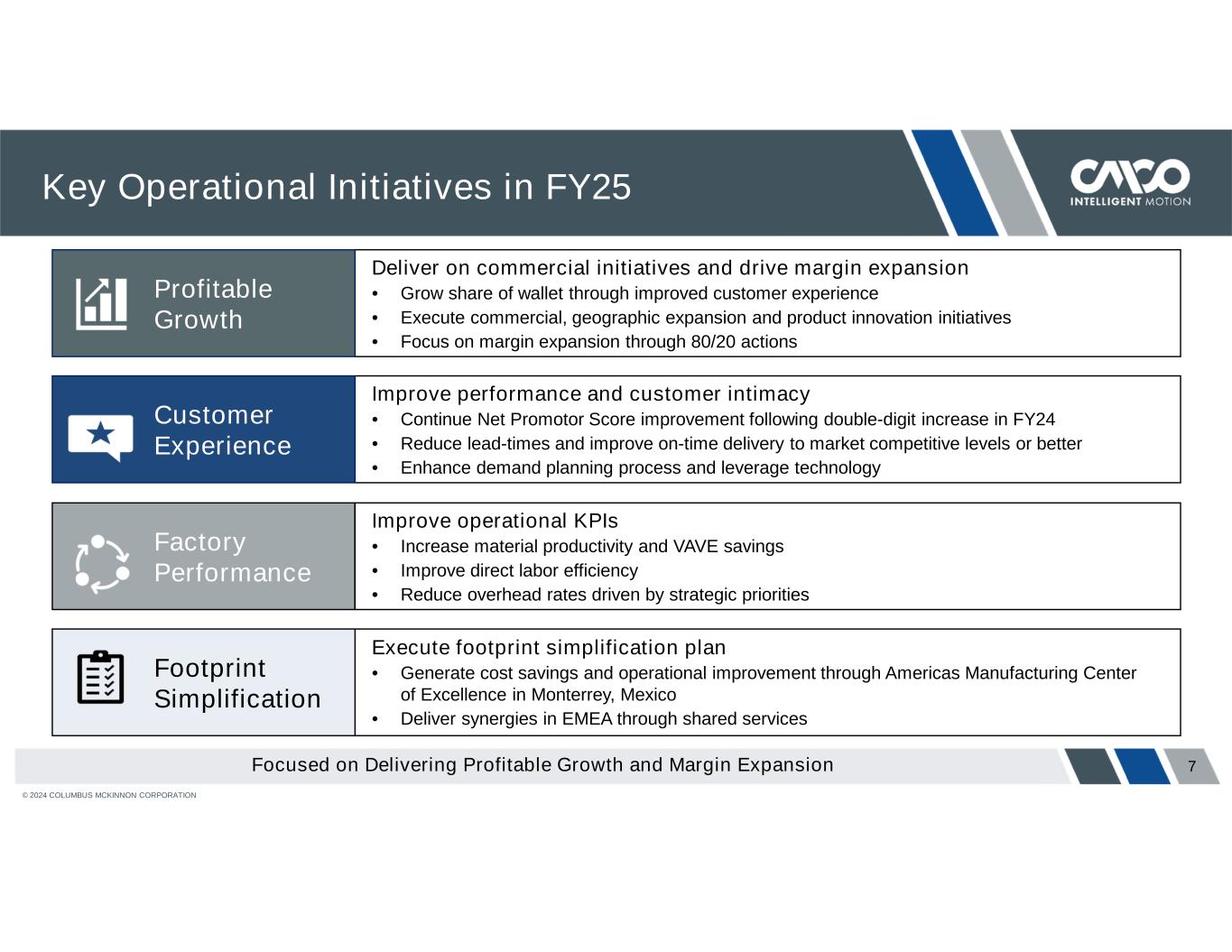 © 2024 COLUMBUS MCKINNON CORPORATION 6Execution of Strategy Delivers Record Performance on Key Metrics in FY24 1 Non-GAAP financial measure; see definition and reconciliation at the end of this Presentation 2 Adjusted Gross Margin and Adjusted EBITDA Margin are non-GAAP financial measures. See supplemental information for additional information on non-GAAP financial measures and a reconciliation to the most comparable GAAP financial measures. Forward-looking estimates of Adjusted Gross Margin and Adjusted EBITDA Margin are made in a manner consistent with the relevant definitions and assumptions noted herein, but reconciliations are not available on a forward-looking basis without unreasonable effort. Executing Plan and Delivering Results Organic growth • Commercial initiatives • New product development • Customer experience improvement M&A growth • Expand precision conveyance platform • Opportunistic with core portfolio • Reimagine portfolio $650 $907 $936 $1,014 ~$1,500 FY21 FY22 FY23 FY24 FY27E Operating initiatives • Operational excellence/VAVE • Operating leverage on growth • Pricing in excess of material inflation • Product line simplification • Factory simplification Margin accretive M&A 34.1% 36.1% 36.5% 37.3% ~40% FY21 FY22 FY23 FY24 FY27E GROWTH DRIVERS 11.9% 15.4% 15.8% 16.4% ~21% FY21 FY22 FY23 FY24 FY27E RSG&A leverage on organic and M&A related growth Gross margin expansion Adjusted EBITDA Margin1Adjusted Gross Margin1Net Sales ($ in millions, $M) 22