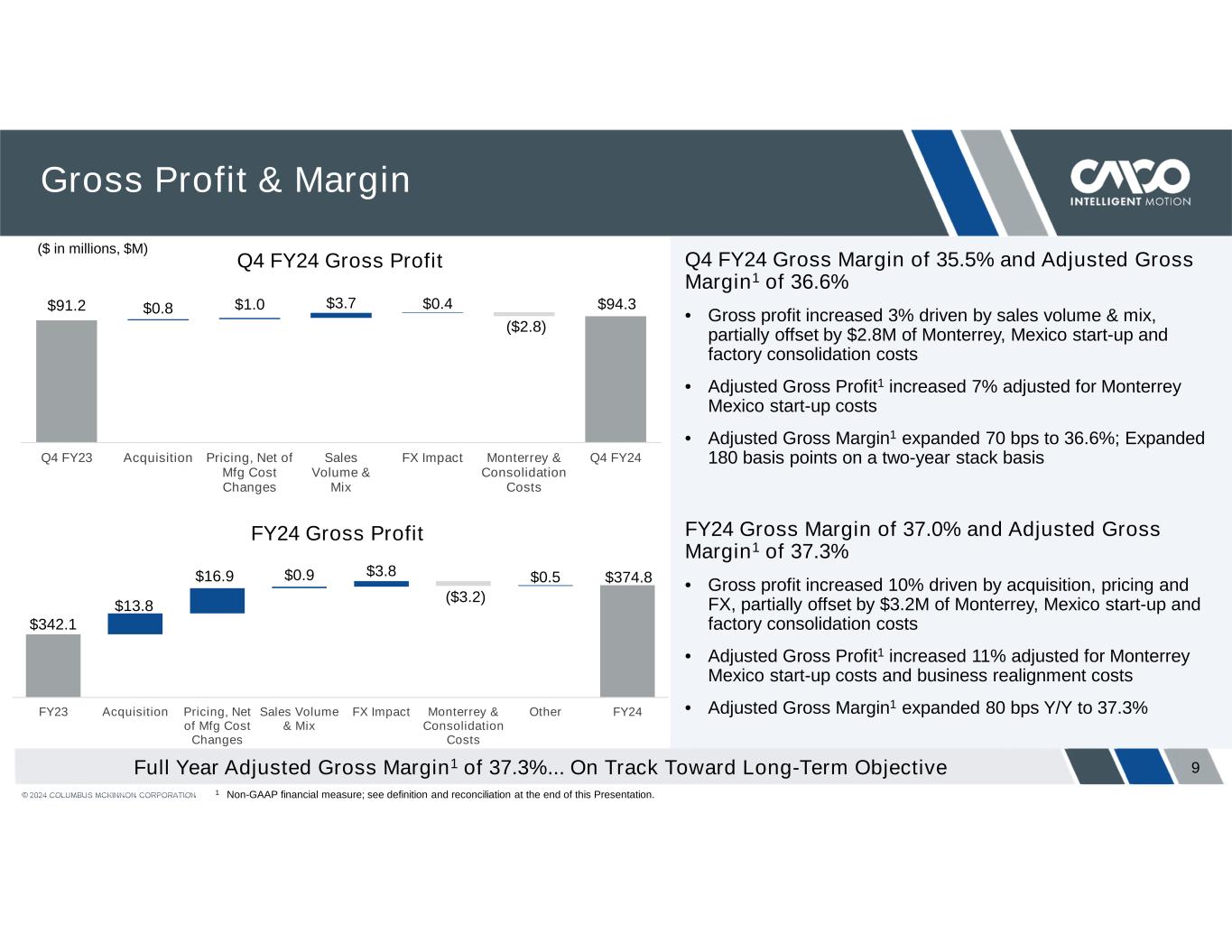© 2024 COLUMBUS MCKINNON CORPORATION 8 Net Sales Delivered Record Sales in Q4 FY24 and FY24 with 5% and 8% Growth Y/Y, Respectively FY24 sales, up 8% Y/Y or 7% excluding FX • Sales in U.S. increased 1% • Sales outside of the U.S. increased 20% or 17% excluding FX o montratec contributed 9% to growth o Sales up 8%, excluding acquisition Q4 FY24 sales, up 5% Y/Y or 4% excluding FX • Sales in U.S. increased 4% driven by volume and price • Sales outside of the U.S. increased 6% or 5% excluding FX o montratec contributed 4% of growth Delivered Q4 FY24 double-digit growth Y/Y in precision conveyance • Sales up 23%; up 9% excluding montratec acquisition ($ in millions, $M)