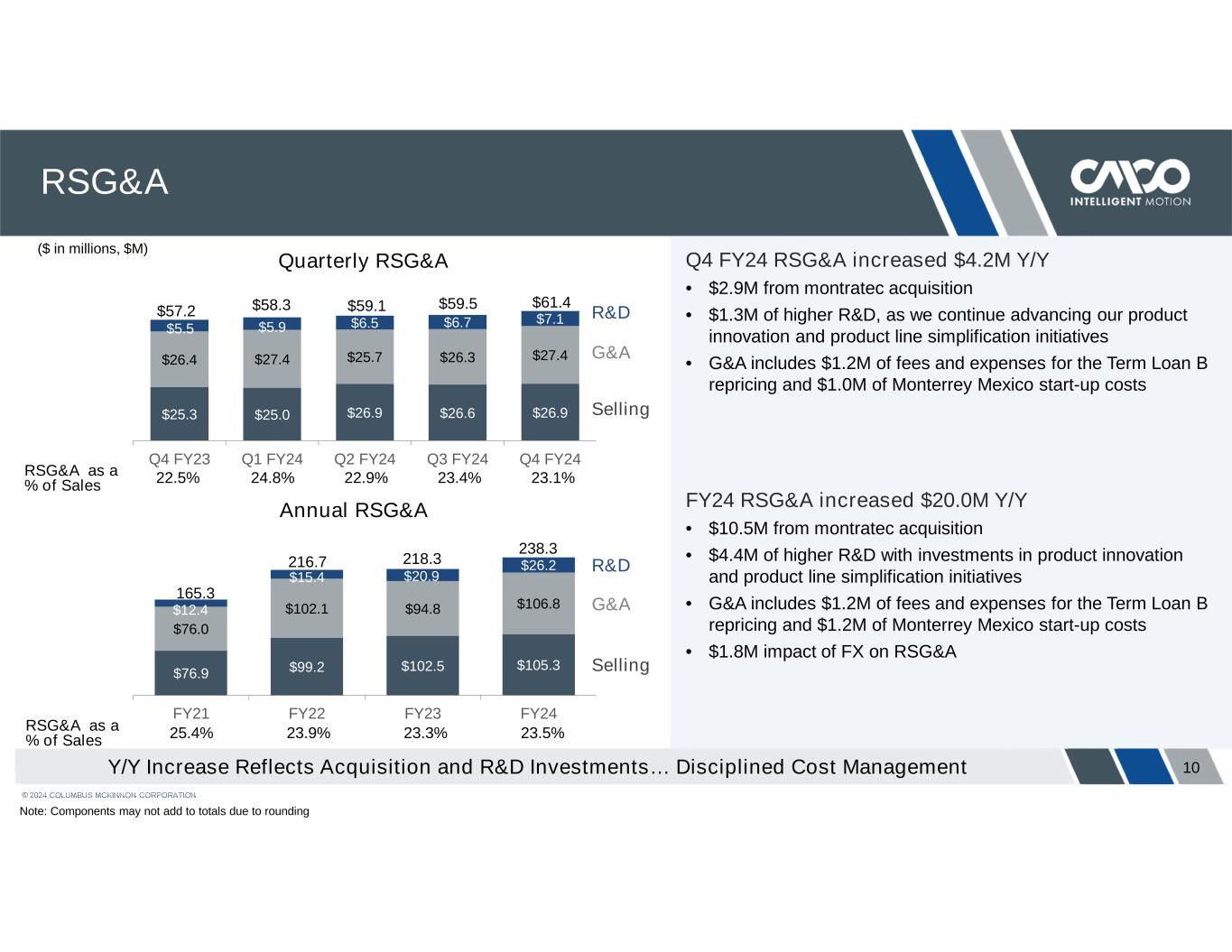 © 2024 COLUMBUS MCKINNON CORPORATION 9 Gross Profit & Margin Full Year Adjusted Gross Margin1 of 37.3%... On Track Toward Long-Term Objective 1 Non-GAAP financial measure; see definition and reconciliation at the end of this Presentation. Q4 FY24 Gross Margin of 35.5% and Adjusted Gross Margin1 of 36.6% • Gross profit increased 3% driven by sales volume & mix, partially offset by $2.8M of Monterrey, Mexico start-up and factory consolidation costs • Adjusted Gross Profit1 increased 7% adjusted for Monterrey Mexico start-up costs • Adjusted Gross Margin1 expanded 70 bps to 36.6%; Expanded 180 basis points on a two-year stack basis $342.1 $374.8 $13.8 $16.9 $0.9 $3.8 $0.5 ($3.2) FY23 Acquisition Pricing, Net of Mfg Cost Changes Sales Volume & Mix FX Impact Monterrey & Consolidation Costs Other FY24 FY24 Gross Profit $91.2 $94.3$0.8 $1.0 $3.7 $0.4 ($2.8) Q4 FY23 Acquisition Pricing, Net of Mfg Cost Changes Sales Volume & Mix FX Impact Monterrey & Consolidation Costs Q4 FY24 Q4 FY24 Gross Profit FY24 Gross Margin of 37.0% and Adjusted Gross Margin1 of 37.3% • Gross profit increased 10% driven by acquisition, pricing and FX, partially offset by $3.2M of Monterrey, Mexico start-up and factory consolidation costs • Adjusted Gross Profit1 increased 11% adjusted for Monterrey Mexico start-up costs and business realignment costs • Adjusted Gross Margin1 expanded 80 bps Y/Y to 37.3% ($ in millions, $M)