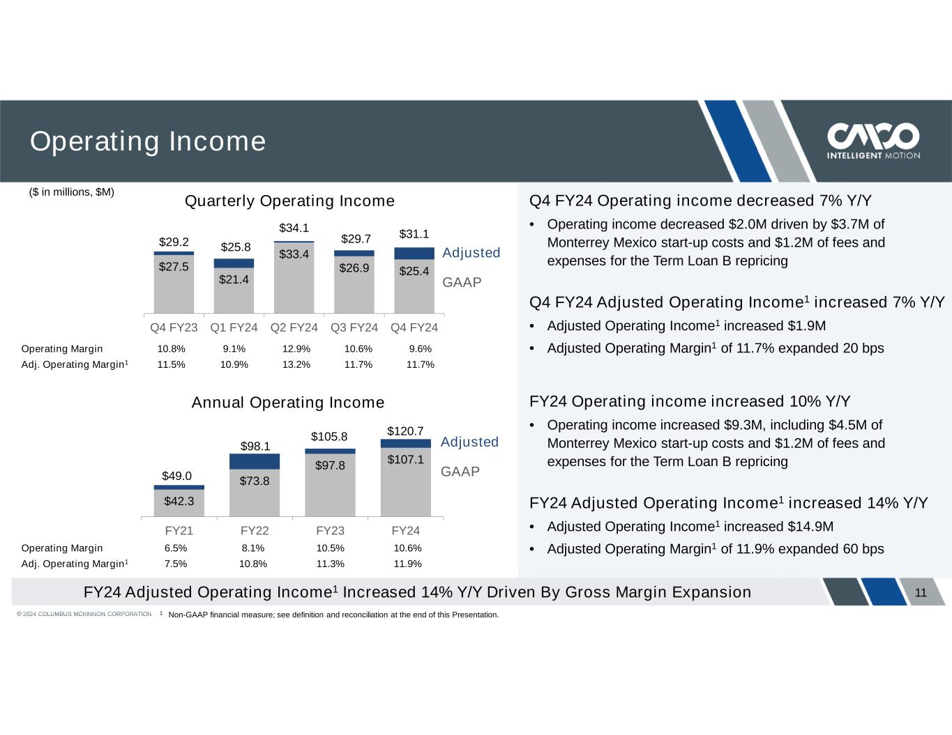 © 2024 COLUMBUS MCKINNON CORPORATION 10 RSG&A $25.3 $25.0 $26.9 $26.6 $26.9 $26.4 $27.4 $25.7 $26.3 $27.4 $5.5 $5.9 $6.5 $6.7 $7.1 $57.2 $58.3 $59.1 $59.5 $61.4 Q4 FY23 Q1 FY24 Q2 FY24 Q3 FY24 Q4 FY24 Quarterly RSG&A Q4 FY24 RSG&A increased $4.2M Y/Y • $2.9M from montratec acquisition • $1.3M of higher R&D, as we continue advancing our product innovation and product line simplification initiatives • G&A includes $1.2M of fees and expenses for the Term Loan B repricing and $1.0M of Monterrey Mexico start-up costs FY24 RSG&A increased $20.0M Y/Y • $10.5M from montratec acquisition • $4.4M of higher R&D with investments in product innovation and product line simplification initiatives • G&A includes $1.2M of fees and expenses for the Term Loan B repricing and $1.2M of Monterrey Mexico start-up costs • $1.8M impact of FX on RSG&A Note: Components may not add to totals due to rounding Y/Y Increase Reflects Acquisition and R&D Investments… Disciplined Cost Management 23.1%23.4%22.9%24.8%22.5%RSG&A as a % of Sales $76.9 $99.2 $102.5 $105.3 $76.0 $102.1 $94.8 $106.8$12.4 $15.4 $20.9 $26.2 165.3 216.7 218.3 238.3 FY21 FY22 FY23 FY24 Annual RSG&A 23.5%23.3%23.9%25.4%RSG&A as a % of Sales R&D Selling G&A R&D Selling G&A ($ in millions, $M)