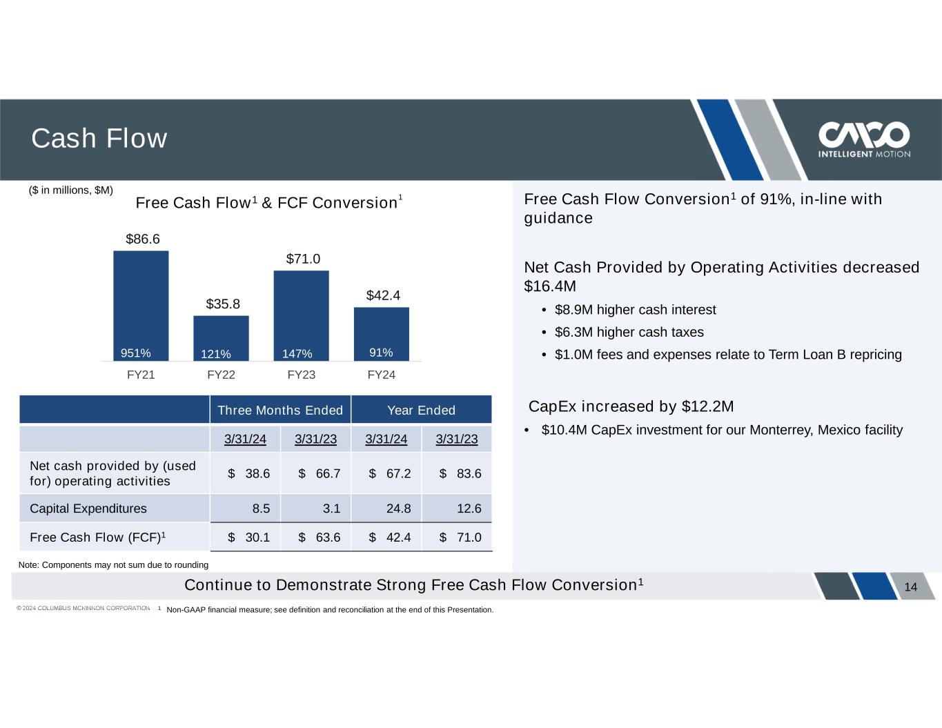 © 2024 COLUMBUS MCKINNON CORPORATION 13 Adjusted EBITDA Adjusted EBITDA1 increased 8% in Q4 FY24 Y/Y • Grew Adjusted Operating Income1 $1.9M or 7%, driven by top-line growth and Adjusted Gross Margin expansion • Increased depreciation and amortization $1.3M Q4 FY24 Adjusted EBITDA Margin1 increased 50 bps Y/Y Adjusted EBITDA1 increased 13% in FY24 Y/Y • Increased Adjusted Operating Income1 by $14.9M or 14%, driven by top-line growth and Adjusted Gross Margin expansion • Increased depreciation and amortization $4.0M Adjusted EBITDA Margin1 increased 60 bps in FY24 Y/Y • Targeting ~21% Adjusted EBITDA Margin1 in FY27 • Expect 80/20 initiatives, factory simplification, and operating leverage on increased scale to drive continued margin expansion FY24 Adjusted EBITDA1 Increased 13% Y/Y Driven By Gross Margin Expansion and Leverage on Growth Quarterly Adjusted EBITDA1 $39.7 $36.6 $45.7 $41.3 $43.0 Q4 FY23 Q1 FY24 Q2 FY24 Q3 FY24 Q4 FY24 1 Non-GAAP financial measure; see definition and reconciliation at the end of this Presentation. 16.2%16.3%17.7%15.6%15.7%Adj. EBITDA Margin1 Annual Adjusted EBITDA1 $77.2 $140.1 $147.8 $166.7 FY21 FY22 FY23 FY24 16.4%15.8%15.4%11.9%Adj. EBITDA Margin1 ($ in millions, $M)