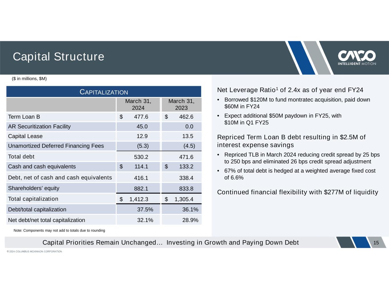 © 2024 COLUMBUS MCKINNON CORPORATION 14 $86.6 $35.8 $71.0 $42.4 951% 121% 147% 91% FY21 FY22 FY23 FY24 Free Cash Flow1 & FCF Conversion 1 Cash Flow Note: Components may not sum due to rounding Year EndedThree Months Ended 3/31/233/31/243/31/233/31/24 $ 83.6$ 67.2$ 66.7$ 38.6 Net cash provided by (used for) operating activities 12.624.83.18.5Capital Expenditures $ 71.0$ 42.4$ 63.6$ 30.1Free Cash Flow (FCF)1 Free Cash Flow Conversion1 of 91%, in-line with guidance Net Cash Provided by Operating Activities decreased $16.4M • $8.9M higher cash interest • $6.3M higher cash taxes • $1.0M fees and expenses relate to Term Loan B repricing CapEx increased by $12.2M • $10.4M CapEx investment for our Monterrey, Mexico facility Continue to Demonstrate Strong Free Cash Flow Conversion1 1 Non-GAAP financial measure; see definition and reconciliation at the end of this Presentation. ($ in millions, $M)