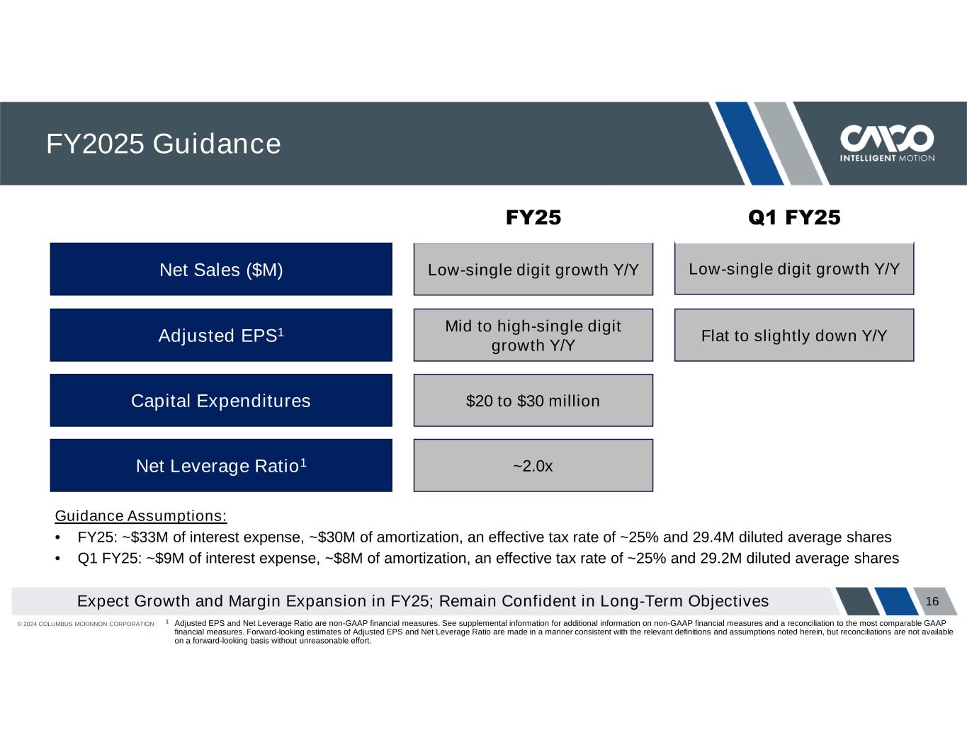 © 2024 COLUMBUS MCKINNON CORPORATION 15 Capital Structure Net Leverage Ratio1 of 2.4x as of year end FY24 • Borrowed $120M to fund montratec acquisition, paid down $60M in FY24 • Expect additional $50M paydown in FY25, with $10M in Q1 FY25 Repriced Term Loan B debt resulting in $2.5M of interest expense savings • Repriced TLB in March 2024 reducing credit spread by 25 bps to 250 bps and eliminated 26 bps credit spread adjustment • 67% of total debt is hedged at a weighted average fixed cost of 6.6% Continued financial flexibility with $277M of liquidity Capital Priorities Remain Unchanged… Investing in Growth and Paying Down Debt CAPITALIZATION March 31, 2023 March 31, 2024 $ 462.6$ 477.6Term Loan B 0.045.0AR Securitization Facility 13.512.9Capital Lease (4.5) (5.3)Unamortized Deferred Financing Fees 471.6530.2Total debt $ 133.2$ 114.1Cash and cash equivalents 338.4416.1Debt, net of cash and cash equivalents 833.8882.1Shareholders’ equity $ 1,305.4$ 1,412.3Total capitalization 36.1%37.5%Debt/total capitalization 28.9%32.1%Net debt/net total capitalization Note: Components may not add to totals due to rounding ($ in millions, $M)