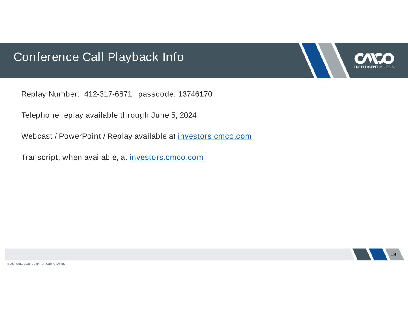 © 2024 COLUMBUS MCKINNON CORPORATION 19 Conference Call Playback Info Replay Number: 412-317-6671 passcode: 13746170 Telephone replay available through June 5, 2024 Webcast / PowerPoint / Replay available at investors.cmco.com Transcript, when available, at investors.cmco.com
