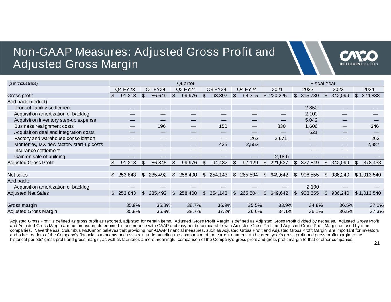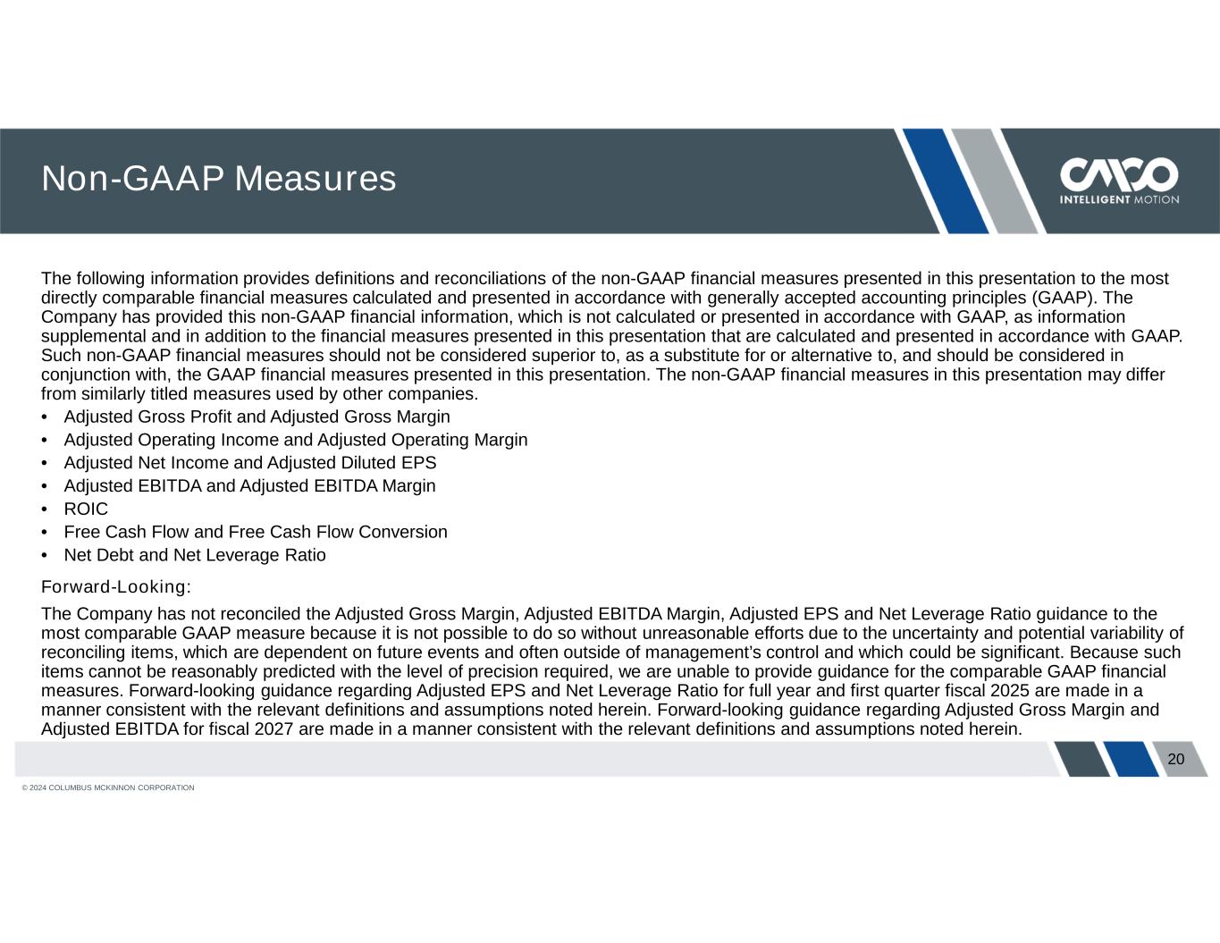 © 2024 COLUMBUS MCKINNON CORPORATION 20 The following information provides definitions and reconciliations of the non-GAAP financial measures presented in this presentation to the most directly comparable financial measures calculated and presented in accordance with generally accepted accounting principles (GAAP). The Company has provided this non-GAAP financial information, which is not calculated or presented in accordance with GAAP, as information supplemental and in addition to the financial measures presented in this presentation that are calculated and presented in accordance with GAAP. Such non-GAAP financial measures should not be considered superior to, as a substitute for or alternative to, and should be considered in conjunction with, the GAAP financial measures presented in this presentation. The non-GAAP financial measures in this presentation may differ from similarly titled measures used by other companies. • Adjusted Gross Profit and Adjusted Gross Margin • Adjusted Operating Income and Adjusted Operating Margin • Adjusted Net Income and Adjusted Diluted EPS • Adjusted EBITDA and Adjusted EBITDA Margin • ROIC • Free Cash Flow and Free Cash Flow Conversion • Net Debt and Net Leverage Ratio Forward-Looking: The Company has not reconciled the Adjusted Gross Margin, Adjusted EBITDA Margin, Adjusted EPS and Net Leverage Ratio guidance to the most comparable GAAP measure because it is not possible to do so without unreasonable efforts due to the uncertainty and potential variability of reconciling items, which are dependent on future events and often outside of management’s control and which could be significant. Because such items cannot be reasonably predicted with the level of precision required, we are unable to provide guidance for the comparable GAAP financial measures. Forward-looking guidance regarding Adjusted EPS and Net Leverage Ratio for full year and first quarter fiscal 2025 are made in a manner consistent with the relevant definitions and assumptions noted herein. Forward-looking guidance regarding Adjusted Gross Margin and Adjusted EBITDA for fiscal 2027 are made in a manner consistent with the relevant definitions and assumptions noted herein. Non-GAAP Measures
