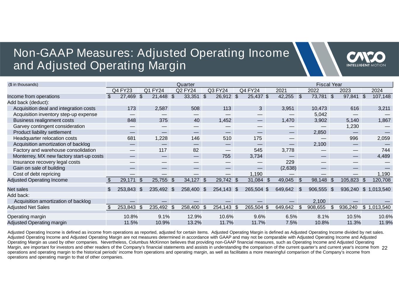 © 2024 COLUMBUS MCKINNON CORPORATION 21 Fiscal YearQuarter($ in thousands) 2024202320222021Q4 FY24Q3 FY24Q2 FY24Q1 FY24Q4 FY23 $ 374,838 $ 342,099 $ 315,730 $ 220,225 $ 94,315 $ 93,897 $ 99,976 $ 86,649 $ 91,218 Gross profit Add back (deduct): ——2,850 ——————Product liability settlement ——2,100 ——————Acquisition amortization of backlog ——5,042 ——————Acquisition inventory step-up expense 346 —1,606 830 —150 —196 —Business realignment costs ——521 ——————Acquisition deal and integration costs 262 ——2,671 262————Factory and warehouse consolidation 2,987 ———2,552435———Monterrey, MX new factory start-up costs —————————Insurance settlement ———(2,189)—————Gain on sale of building $ 378,433 $ 342,099 $ 327,849 $ 221,537 $ 97,129 $ 94,482 $ 99,976 $ 86,845 $ 91,218 Adjusted Gross Profit $ 1,013,540 $ 936,240 $ 906,555 $ 649,642 $ 265,504$ 254,143 $ 258,400 $ 235,492 $ 253,843 Net sales Add back: ——2,100 ——————Acquisition amortization of backlog $ 1,013,540 $ 936,240 $ 908,655 $ 649,642 $ 265,504$ 254,143 $ 258,400 $ 235,492 $ 253,843 Adjusted Net Sales 37.0%36.5%34.8%33.9%35.5%36.9%38.7%36.8%35.9%Gross margin 37.3%36.5%36.1%34.1%36.6%37.2%38.7%36.9%35.9%Adjusted Gross Margin Adjusted Gross Profit is defined as gross profit as reported, adjusted for certain items. Adjusted Gross Profit Margin is defined as Adjusted Gross Profit divided by net sales. Adjusted Gross Profit and Adjusted Gross Margin are not measures determined in accordance with GAAP and may not be comparable with Adjusted Gross Profit and Adjusted Gross Profit Margin as used by other companies. Nevertheless, Columbus McKinnon believes that providing non-GAAP financial measures, such as Adjusted Gross Profit and Adjusted Gross Profit Margin, are important for investors and other readers of the Company’s financial statements and assists in understanding the comparison of the current quarter’s and current year's gross profit and gross profit margin to the historical periods' gross profit and gross margin, as well as facilitates a more meaningful comparison of the Company’s gross profit and gross profit margin to that of other companies. Non-GAAP Measures: Adjusted Gross Profit and Adjusted Gross Margin