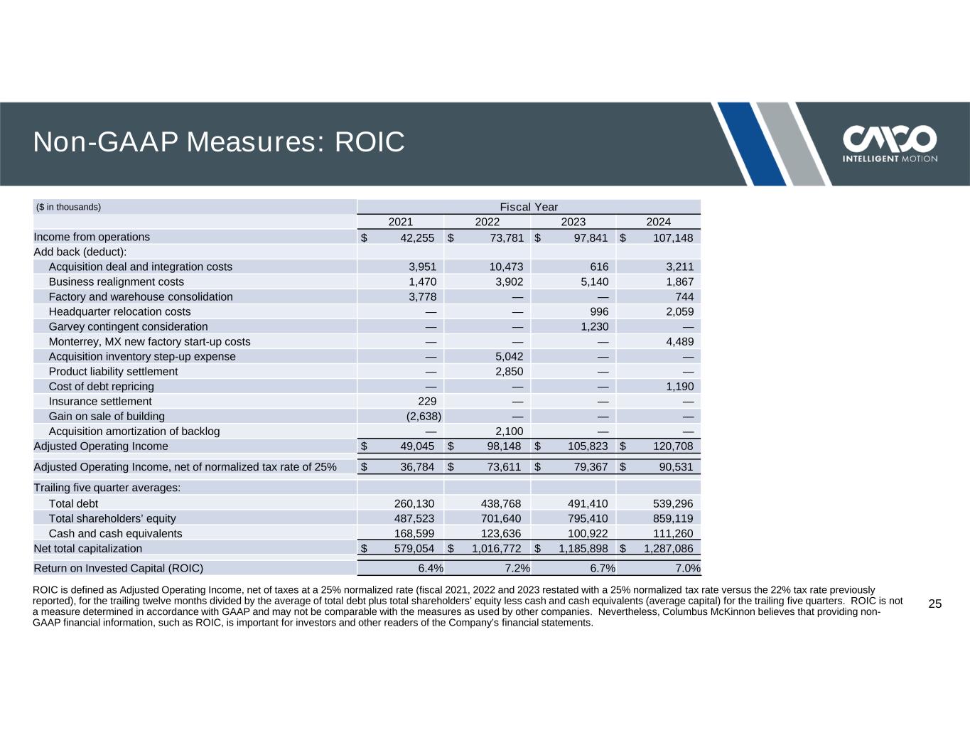 © 2024 COLUMBUS MCKINNON CORPORATION 24 Adjusted EBITDA is defined as net income before interest expense, income taxes, depreciation, amortization, and other adjustments. Adjusted EBITDA Margin is defined as Adjusted EBITDA divided by net sales. Adjusted EBITDA and Adjusted EBITDA Margin are not measures determined in accordance with GAAP and may not be comparable with Adjusted EBITDA and Adjusted EBITDA Margin as used by other companies. Nevertheless, Columbus McKinnon believes that providing non-GAAP financial measures, such as Adjusted EBITDA and Adjusted EBITDA Margin, are important for investors and other readers of the Company’s financial statements. Fiscal YearQuarter($ in thousands) 2024202320222021Q4 FY24Q3 FY24Q2 FY24Q1 FY24Q4 FY23 $ 46,625$ 48,429 $ 29,660 $ 9,106 $ 11,809$ 9,728 $ 15,813 $ 9,275 $ 13,895 Net income Add back (deduct): 14,90226,046 8,786 9702,497 3,911 5,100 3,394 7,499 Income tax expense (benefit) 37,957 27,942 20,126 12,0819,169 9,952 10,211 8,625 7,668 Interest and debt expense (1,759)(315)(46)(1,693)(547)(758)88 (543)(483)Investment (income) loss 1,826(2,189)1,574 941752(1,155)1,746 483 (1,037)Foreign currency exchange (gain) loss 7,597(2,072)(1,122)20,8501,757 5,234 393 214 (73)Other (income) expense, net 45,945 41,947 41,924 28,15311,893 11,570 11,592 10,890 10,567 Depreciation and amortization expense ——14,803 ——————Cost of debt refinancing 3,211 616 10,473 3,951 3 113 508 2,587 173 Acquisition deal and integration costs ——5,042 ——————Acquisition inventory step-up expense ——2,850 ——————Product liability settlement 1,867 5,140 3,902 1,470 —1,452 40 375 848 Business realignment costs 744——3,778 545 —82 117 —Factory and warehouse consolidation 2,059 996 ——175510 146 1,228 681 Headquarter relocation costs —1,230 ———————Garvey contingent consideration ——2,100 ——————Acquisition amortization of backlog ———229—————Insurance settlement ———(2,638)—————Gain on sale of building 4,489 ———3,734 755 ———Monterrey, MX new factory start-up costs 1,190 ———1,190 ————Cost of debt repricing $ 166,653 $ 147,770 $ 140,072 $ 77,198 $ 42,977 $ 41,312 $ 45,719 $ 36,645 $ 39,738 Adjusted EBITDA $ 1,013,540 $ 936,240 $ 906,555 $ 649,642 $ 265,504 $ 254,143 $ 258,400 $ 235,492 $ 253,843 Sales Add back: ——2,100 ——————Acquisition amortization of backlog $ 1,013,540$ 936,240 $ 908,655 $ 649,642$ 265,504 $ 254,143 $ 258,400 $ 235,492 $ 253,843 Adjusted Net Sales 4.6%5.2%3.3%1.4%4.4%3.8%6.1%3.9%5.5%Net income margin 16.4%15.8%15.4%11.9%16.2%16.3%17.7%15.6%15.7%Adjusted EBITDA margin Non-GAAP Measures: Adjusted EBITDA and Adjusted EBITDA Margin