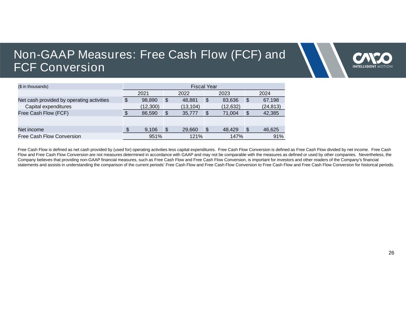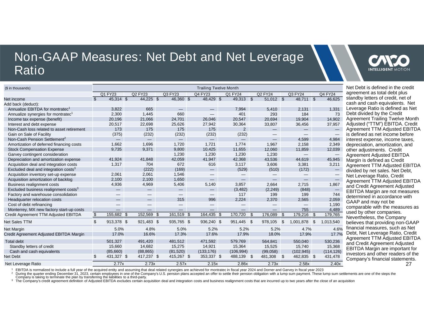 © 2024 COLUMBUS MCKINNON CORPORATION Free Cash Flow is defined as net cash provided by (used for) operating activities less capital expenditures. Free Cash Flow Conversion is defined as Free Cash Flow divided by net income. Free Cash Flow and Free Cash Flow Conversion are not measures determined in accordance with GAAP and may not be comparable with the measures as defined or used by other companies. Nevertheless, the Company believes that providing non-GAAP financial measures, such as Free Cash Flow and Free Cash Flow Conversion, is important for investors and other readers of the Company’s financial statements and assists in understanding the comparison of the current periods’ Free Cash Flow and Free Cash Flow Conversion to Free Cash Flow and Free Cash Flow Conversion for historical periods. 26 Fiscal Year($ in thousands) 2024202320222021 $ 67,198 $ 83,636 $ 48,881 $ 98,890Net cash provided by operating activities (24,813)(12,632)(13,104)(12,300)Capital expenditures $ 42,385 $ 71,004 $ 35,777 $ 86,590Free Cash Flow (FCF) $ 46,625$ 48,429 $ 29,660 $ 9,106Net income 91%147%121%951%Free Cash Flow Conversion Non-GAAP Measures: Free Cash Flow (FCF) and FCF Conversion