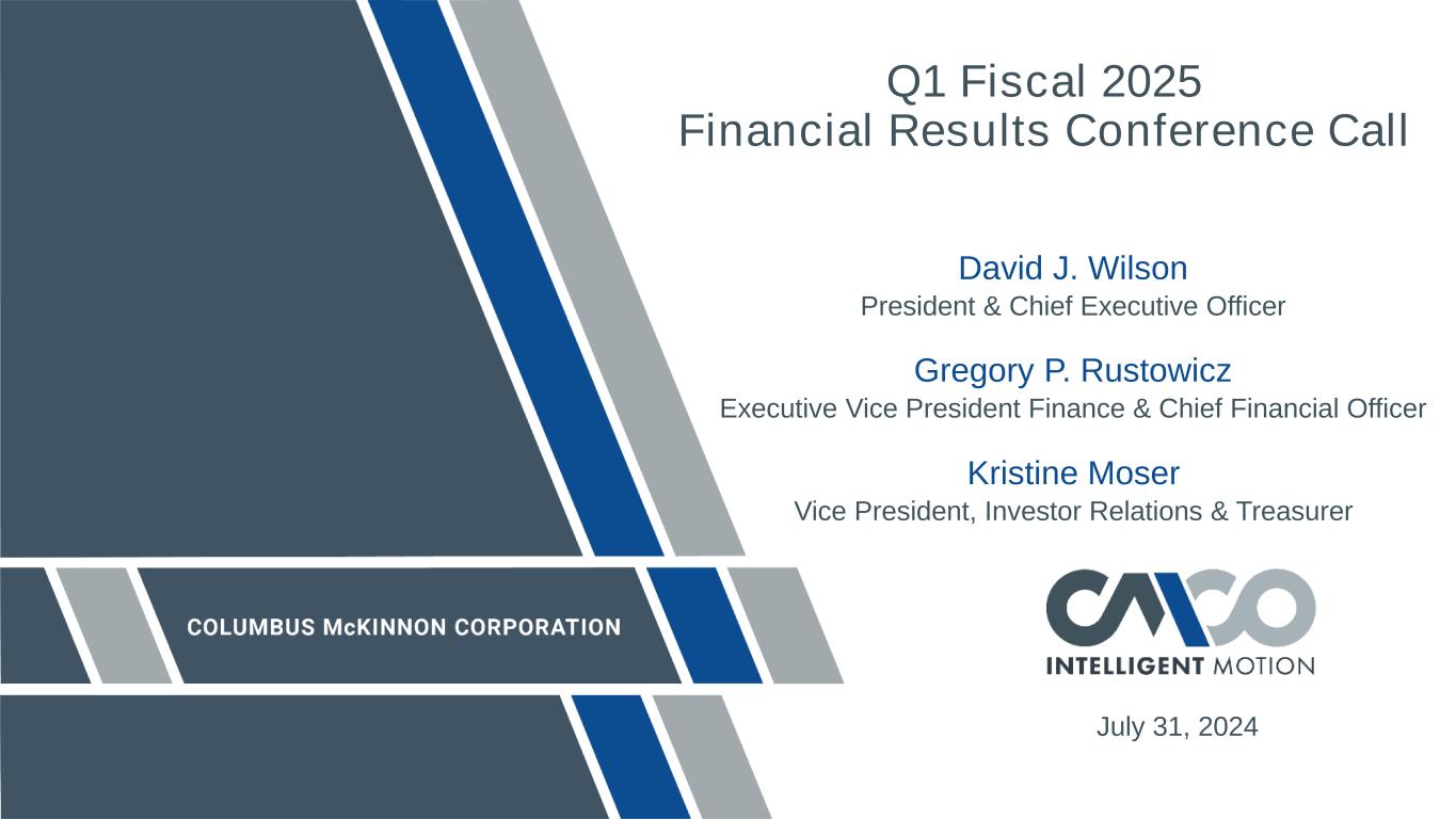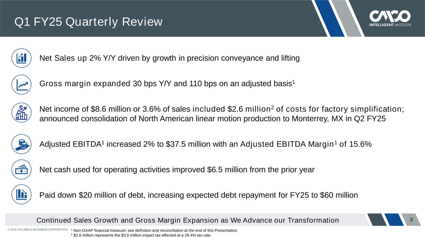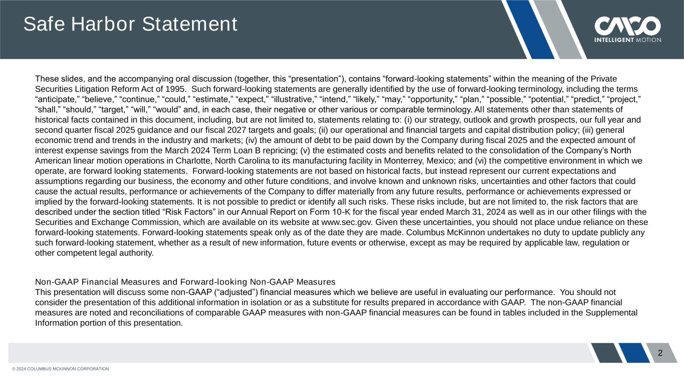 © 2024 COLUMBUS MCKINNON CORPORATION These slides, and the accompanying oral discussion (together, this “presentation”), contains “forward-looking statements” within the meaning of the Private Securities Litigation Reform Act of 1995. Such forward-looking statements are generally identified by the use of forward-looking terminology, including the terms “anticipate,” “believe,” “continue,” “could,” “estimate,” “expect,” “illustrative,” “intend,” “likely,” “may,” “opportunity,” “plan,” “possible,” “potential,” “predict,” “project,” “shall,” “should,” “target,” “will,” “would” and, in each case, their negative or other various or comparable terminology. All statements other than statements of historical facts contained in this document, including, but are not limited to, statements relating to: (i) our strategy, outlook and growth prospects, our full year and second quarter fiscal 2025 guidance and our fiscal 2027 targets and goals; (ii) our operational and financial targets and capital distribution policy; (iii) general economic trend and trends in the industry and markets; (iv) the amount of debt to be paid down by the Company during fiscal 2025 and the expected amount of interest expense savings from the March 2024 Term Loan B repricing; (v) the estimated costs and benefits related to the consolidation of the Company’s North American linear motion operations in Charlotte, North Carolina to its manufacturing facility in Monterrey, Mexico; and (vi) the competitive environment in which we operate, are forward looking statements. Forward-looking statements are not based on historical facts, but instead represent our current expectations and assumptions regarding our business, the economy and other future conditions, and involve known and unknown risks, uncertainties and other factors that could cause the actual results, performance or achievements of the Company to differ materially from any future results, performance or achievements expressed or implied by the forward-looking statements. It is not possible to predict or identify all such risks. These risks include, but are not limited to, the risk factors that are described under the section titled “Risk Factors” in our Annual Report on Form 10-K for the fiscal year ended March 31, 2024 as well as in our other filings with the Securities and Exchange Commission, which are available on its website at www.sec.gov. Given these uncertainties, you should not place undue reliance on these forward-looking statements. Forward-looking statements speak only as of the date they are made. Columbus McKinnon undertakes no duty to update publicly any such forward-looking statement, whether as a result of new information, future events or otherwise, except as may be required by applicable law, regulation or other competent legal authority. Non-GAAP Financial Measures and Forward-looking Non-GAAP Measures This presentation will discuss some non-GAAP (“adjusted”) financial measures which we believe are useful in evaluating our performance. You should not consider the presentation of this additional information in isolation or as a substitute for results prepared in accordance with GAAP. The non-GAAP financial measures are noted and reconciliations of comparable GAAP measures with non-GAAP financial measures can be found in tables included in the Supplemental Information portion of this presentation. Safe Harbor Statement 2