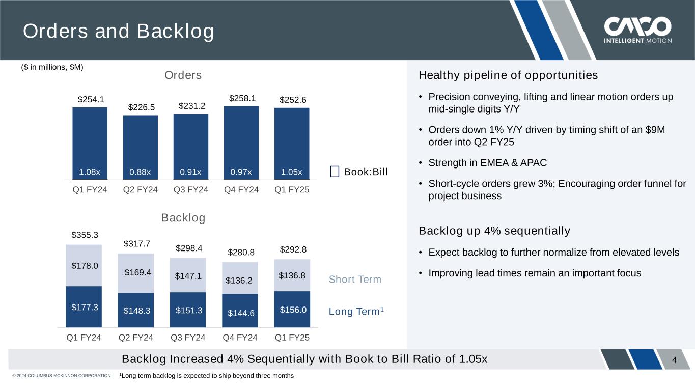 © 2024 COLUMBUS MCKINNON CORPORATION 3 Q1 FY25 Quarterly Review • Net Sales up 2% Y/Y driven by growth in precision conveyance and lifting • Gross margin expanded 30 bps Y/Y and 110 bps on an adjusted basis1 • Net income of $8.6 million or 3.6% of sales included $2.6 million2 of costs for factory simplification; announced consolidation of North American linear motion production to Monterrey, MX in Q2 FY25 • Adjusted EBITDA1 increased 2% to $37.5 million with an Adjusted EBITDA Margin1 of 15.6% • Net cash used for operating activities improved $6.5 million from the prior year • Paid down $20 million of debt, increasing expected debt repayment for FY25 to $60 million Continued Sales Growth and Gross Margin Expansion as We Advance our Transformation 1 Non-GAAP financial measure; see definition and reconciliation at the end of this Presentation. 2 $2.6 million represents the $3.6 million impact tax effected at a 28.4% tax rate.