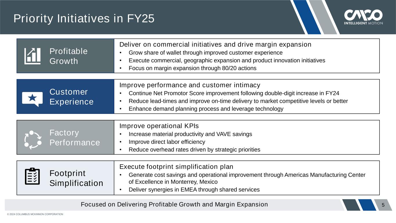 © 2024 COLUMBUS MCKINNON CORPORATION 4 Orders and Backlog 1Long term backlog is expected to ship beyond three months $177.3 $148.3 $151.3 $144.6 $156.0 $178.0 $169.4 $147.1 $136.2 $136.8 $355.3 $317.7 $298.4 $280.8 $292.8 Q1 FY24 Q2 FY24 Q3 FY24 Q4 FY24 Q1 FY25 Healthy pipeline of opportunities • Precision conveying, lifting and linear motion orders up mid-single digits Y/Y • Orders down 1% Y/Y driven by timing shift of an $9M order into Q2 FY25 • Strength in EMEA & APAC • Short-cycle orders grew 3%; Encouraging order funnel for project business Backlog up 4% sequentially • Expect backlog to further normalize from elevated levels • Improving lead times remain an important focus Backlog Increased 4% Sequentially with Book to Bill Ratio of 1.05x Book:Bill $254.1 $226.5 $231.2 $258.1 $252.6 1.08x 0.88x 0.91x 0.97x 1.05x Q1 FY24 Q2 FY24 Q3 FY24 Q4 FY24 Q1 FY25 Orders Short Term Long Term1 Backlog ($ in millions, $M)