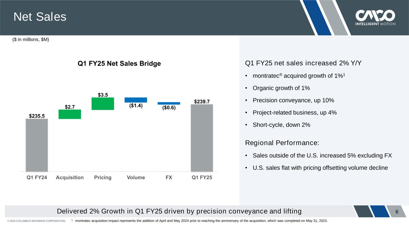 © 2024 COLUMBUS MCKINNON CORPORATION 5 Priority Initiatives in FY25 Focused on Delivering Profitable Growth and Margin Expansion Execute footprint simplification plan • Generate cost savings and operational improvement through Americas Manufacturing Center of Excellence in Monterrey, Mexico • Deliver synergies in EMEA through shared services Customer Experience Footprint Simplification Improve performance and customer intimacy • Continue Net Promotor Score improvement following double-digit increase in FY24 • Reduce lead-times and improve on-time delivery to market competitive levels or better • Enhance demand planning process and leverage technology Factory Performance Improve operational KPIs • Increase material productivity and VAVE savings • Improve direct labor efficiency • Reduce overhead rates driven by strategic priorities Profitable Growth Deliver on commercial initiatives and drive margin expansion • Grow share of wallet through improved customer experience • Execute commercial, geographic expansion and product innovation initiatives • Focus on margin expansion through 80/20 actions