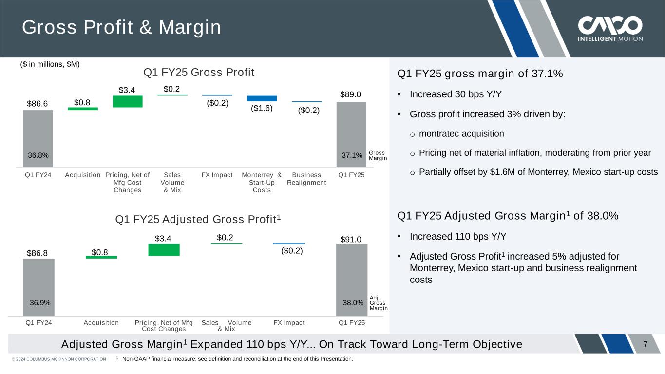 © 2024 COLUMBUS MCKINNON CORPORATION 6 Net Sales Delivered 2% Growth in Q1 FY25 driven by precision conveyance and lifting Q1 FY25 net sales increased 2% Y/Y • montratec® acquired growth of 1%1 • Organic growth of 1% • Precision conveyance, up 10% • Project-related business, up 4% • Short-cycle, down 2% Regional Performance: • Sales outside of the U.S. increased 5% excluding FX • U.S. sales flat with pricing offsetting volume decline ($ in millions, $M) 1 montratec acquisition impact represents the addition of April and May 2024 prior to reaching the anniversary of the acquisition, which was completed on May 31, 2023.