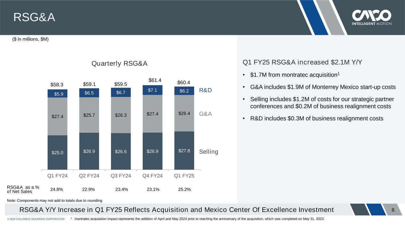© 2024 COLUMBUS MCKINNON CORPORATION 7 Gross Profit & Margin Adjusted Gross Margin1 Expanded 110 bps Y/Y... On Track Toward Long-Term Objective 1 Non-GAAP financial measure; see definition and reconciliation at the end of this Presentation. $86.6 $89.0 $0.8 $3.4 $0.2 ($0.2) ($1.6) ($0.2) Q1 FY24 Acquisition Pricing, Net of Mfg Cost Changes Sales Volume & Mix FX Impact Monterrey & Start-Up Costs Business Realignment Q1 FY25 Q1 FY25 gross margin of 37.1% • Increased 30 bps Y/Y • Gross profit increased 3% driven by: o montratec acquisition o Pricing net of material inflation, moderating from prior year o Partially offset by $1.6M of Monterrey, Mexico start-up costs Q1 FY25 Adjusted Gross Margin1 of 38.0% • Increased 110 bps Y/Y • Adjusted Gross Profit1 increased 5% adjusted for Monterrey, Mexico start-up and business realignment costs ($ in millions, $M) Q1 FY25 Gross Profit $86.8 $91.0 $0.8 $3.4 $0.2 ($0.2) Q1 FY24 Acquisition Pricing, Net of Mfg Cost Changes Sales Volume & Mix FX Impact Q1 FY25 Q1 FY25 Adjusted Gross Profit1 36.8% 37.1% 36.9% 38.0% Gross Margin Adj. Gross Margin