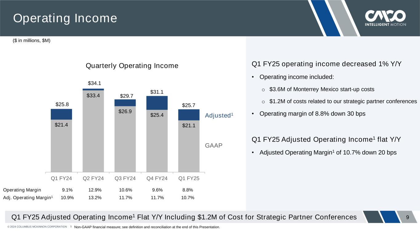 © 2024 COLUMBUS MCKINNON CORPORATION 8 RSG&A $25.0 $26.9 $26.6 $26.9 $27.8 $27.4 $25.7 $26.3 $27.4 $26.4 $5.9 $6.5 $6.7 $7.1 $6.2 $58.3 $59.1 $59.5 $61.4 $60.4 Q1 FY24 Q2 FY24 Q3 FY24 Q4 FY24 Q1 FY25 Q1 FY25 RSG&A increased $2.1M Y/Y • $1.7M from montratec acquisition1 • G&A includes $1.9M of Monterrey Mexico start-up costs • Selling includes $1.2M of costs for our strategic partner conferences and $0.2M of business realignment costs • R&D includes $0.3M of business realignment costs Note: Components may not add to totals due to rounding RSG&A Y/Y Increase in Q1 FY25 Reflects Acquisition and Mexico Center Of Excellence Investment RSG&A as a % of Net Sales 24.8% 22.9% 23.4% 23.1% 25.2% R&D Selling G&A ($ in millions, $M) Quarterly RSG&A 1 montratec acquisition impact represents the addition of April and May 2024 prior to reaching the anniversary of the acquisition, which was completed on May 31, 2023.