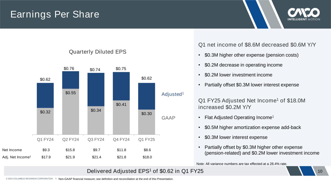 © 2024 COLUMBUS MCKINNON CORPORATION 9 Operating Income Q1 FY25 operating income decreased 1% Y/Y • Operating income included: o $3.6M of Monterrey Mexico start-up costs o $1.2M of costs related to our strategic partner conferences • Operating margin of 8.8% down 30 bps Q1 FY25 Adjusted Operating Income1 flat Y/Y • Adjusted Operating Margin1 of 10.7% down 20 bps Q1 FY25 Adjusted Operating Income1 Flat Y/Y Including $1.2M of Cost for Strategic Partner Conferences $21.4 $33.4 $26.9 $25.4 $21.1 $25.8 $34.1 $29.7 $31.1 $25.7 Q1 FY24 Q2 FY24 Q3 FY24 Q4 FY24 Q1 FY25 1 Non-GAAP financial measure; see definition and reconciliation at the end of this Presentation. Operating Margin 9.1% 12.9% 10.6% 9.6% 8.8% Adj. Operating Margin1 10.9% 13.2% 11.7% 11.7% 10.7% ($ in millions, $M) Quarterly Operating Income Adjusted1 GAAP