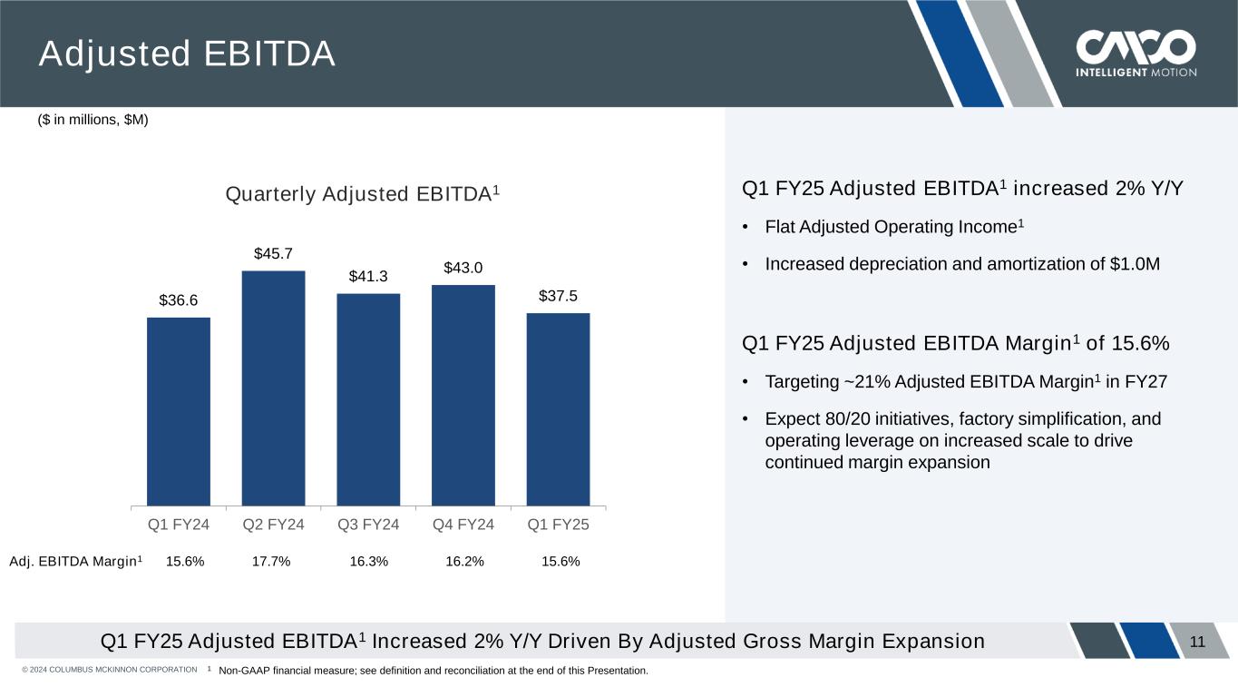 © 2024 COLUMBUS MCKINNON CORPORATION 10 Earnings Per Share Delivered Adjusted EPS1 of $0.62 in Q1 FY25 Quarterly Diluted EPS $0.32 $0.55 $0.34 $0.41 $0.30 $0.62 $0.76 $0.74 $0.75 $0.62 Q1 FY24 Q2 FY24 Q3 FY24 Q4 FY24 Q1 FY25 Q1 net income of $8.6M decreased $0.6M Y/Y • $0.3M higher other expense (pension costs) • $0.2M decrease in operating income • $0.2M lower investment income • Partially offset $0.3M lower interest expense Q1 FY25 Adjusted Net Income1 of $18.0M increased $0.2M Y/Y • Flat Adjusted Operating Income1 • $0.5M higher amortization expense add-back • $0.3M lower interest expense • Partially offset by $0.3M higher other expense (pension-related) and $0.2M lower investment income Adjusted1 GAAP Net Income $9.3 $15.8 $9.7 $11.8 $8.6 Adj. Net Income1 $17.9 $21.9 $21.4 $21.8 $18.0 Note: All variance numbers are tax effected at a 28.4% rate. 1 Non-GAAP financial measure; see definition and reconciliation at the end of this Presentation.
