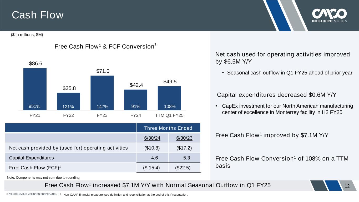 © 2024 COLUMBUS MCKINNON CORPORATION 11 Adjusted EBITDA Q1 FY25 Adjusted EBITDA1 increased 2% Y/Y • Flat Adjusted Operating Income1 • Increased depreciation and amortization of $1.0M Q1 FY25 Adjusted EBITDA Margin1 of 15.6% • Targeting ~21% Adjusted EBITDA Margin1 in FY27 • Expect 80/20 initiatives, factory simplification, and operating leverage on increased scale to drive continued margin expansion Q1 FY25 Adjusted EBITDA1 Increased 2% Y/Y Driven By Adjusted Gross Margin Expansion Quarterly Adjusted EBITDA1 $36.6 $45.7 $41.3 $43.0 $37.5 Q1 FY24 Q2 FY24 Q3 FY24 Q4 FY24 Q1 FY25 1 Non-GAAP financial measure; see definition and reconciliation at the end of this Presentation. Adj. EBITDA Margin1 15.6% 17.7% 16.3% 16.2% 15.6% ($ in millions, $M)