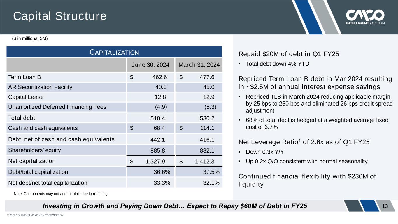 © 2024 COLUMBUS MCKINNON CORPORATION 12 $86.6 $35.8 $71.0 $42.4 $49.5 951% 121% 147% 91% 108% FY21 FY22 FY23 FY24 TTM Q1 FY25 Free Cash Flow1 & FCF Conversion 1 Cash Flow Note: Components may not sum due to rounding Three Months Ended 6/30/24 6/30/23 Net cash provided by (used for) operating activities ($10.8) ($17.2) Capital Expenditures 4.6 5.3 Free Cash Flow (FCF)1 ($ 15.4) ($22.5) Net cash used for operating activities improved by $6.5M Y/Y • Seasonal cash outflow in Q1 FY25 ahead of prior year Capital expenditures decreased $0.6M Y/Y • CapEx investment for our North American manufacturing center of excellence in Monterrey facility in H2 FY25 Free Cash Flow1 improved by $7.1M Y/Y Free Cash Flow Conversion1 of 108% on a TTM basis Free Cash Flow1 increased $7.1M Y/Y with Normal Seasonal Outflow in Q1 FY25 1 Non-GAAP financial measure; see definition and reconciliation at the end of this Presentation. ($ in millions, $M)