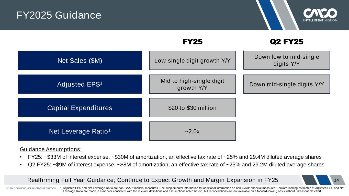 © 2024 COLUMBUS MCKINNON CORPORATION 13 Capital Structure Repaid $20M of debt in Q1 FY25 • Total debt down 4% YTD Repriced Term Loan B debt in Mar 2024 resulting in ~$2.5M of annual interest expense savings • Repriced TLB in March 2024 reducing applicable margin by 25 bps to 250 bps and eliminated 26 bps credit spread adjustment • 68% of total debt is hedged at a weighted average fixed cost of 6.7% Net Leverage Ratio1 of 2.6x as of Q1 FY25 • Down 0.3x Y/Y • Up 0.2x Q/Q consistent with normal seasonality Continued financial flexibility with $230M of liquidity Investing in Growth and Paying Down Debt… Expect to Repay $60M of Debt in FY25 CAPITALIZATION June 30, 2024 March 31, 2024 Term Loan B $ 462.6 $ 477.6 AR Securitization Facility 40.0 45.0 Capital Lease 12.8 12.9 Unamortized Deferred Financing Fees (4.9) (5.3) Total debt 510.4 530.2 Cash and cash equivalents $ 68.4 $ 114.1 Debt, net of cash and cash equivalents 442.1 416.1 Shareholders’ equity 885.8 882.1 Net capitalization $ 1,327.9 $ 1,412.3 Debt/total capitalization 36.6% 37.5% Net debt/net total capitalization 33.3% 32.1% Note: Components may not add to totals due to rounding ($ in millions, $M)