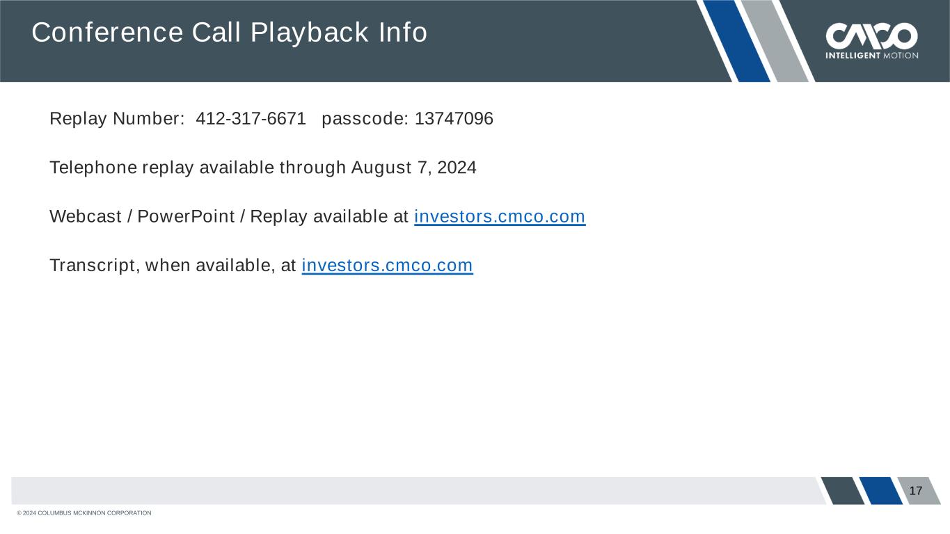 © 2024 COLUMBUS MCKINNON CORPORATION 17 Conference Call Playback Info Replay Number: 412-317-6671 passcode: 13747096 Telephone replay available through August 7, 2024 Webcast / PowerPoint / Replay available at investors.cmco.com Transcript, when available, at investors.cmco.com
