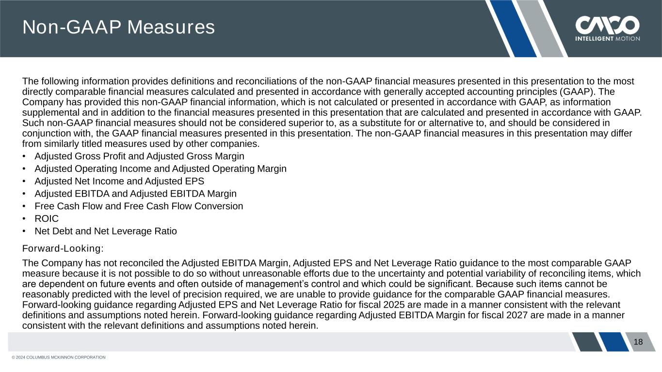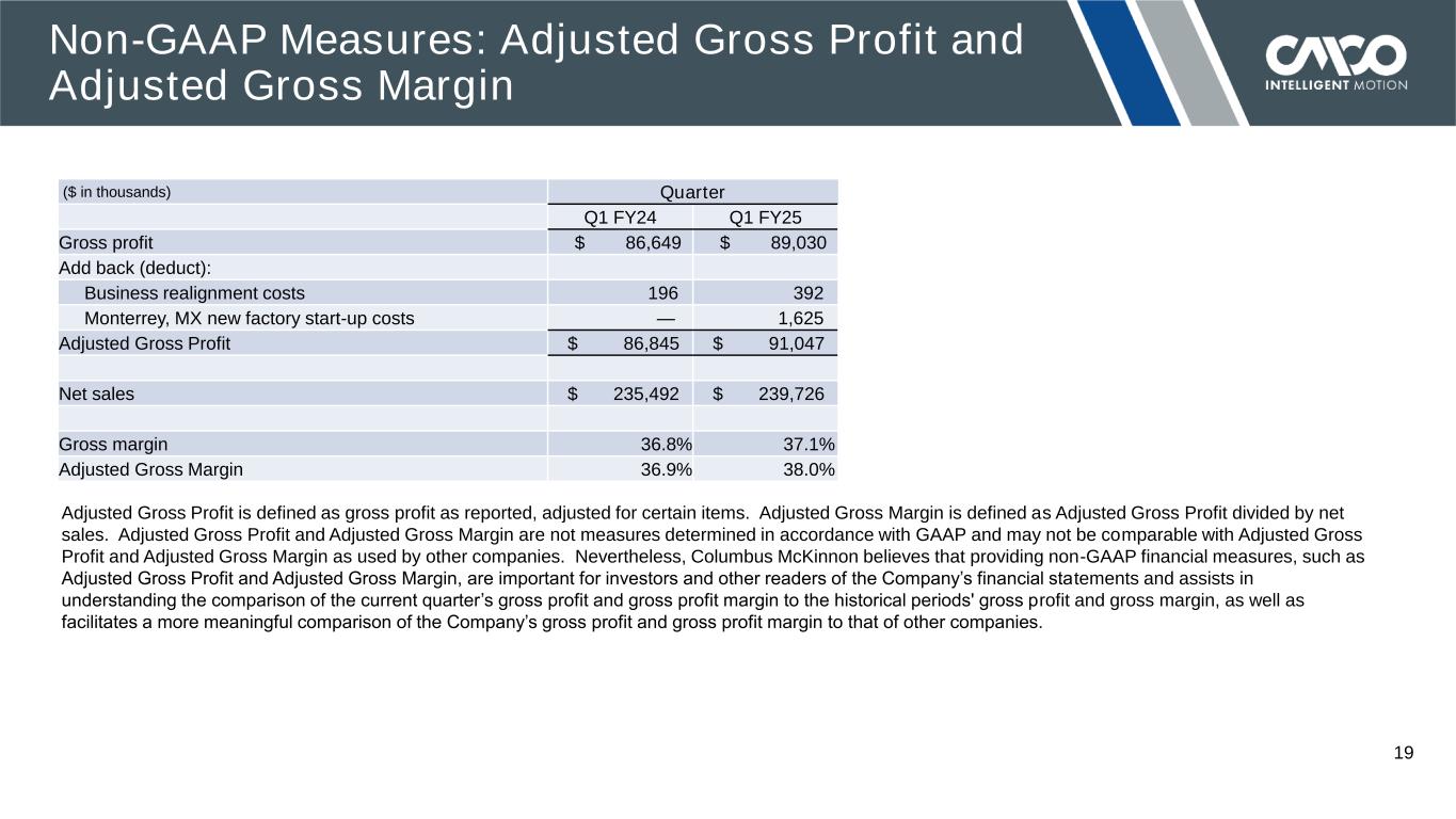 © 2024 COLUMBUS MCKINNON CORPORATION 18 The following information provides definitions and reconciliations of the non-GAAP financial measures presented in this presentation to the most directly comparable financial measures calculated and presented in accordance with generally accepted accounting principles (GAAP). The Company has provided this non-GAAP financial information, which is not calculated or presented in accordance with GAAP, as information supplemental and in addition to the financial measures presented in this presentation that are calculated and presented in accordance with GAAP. Such non-GAAP financial measures should not be considered superior to, as a substitute for or alternative to, and should be considered in conjunction with, the GAAP financial measures presented in this presentation. The non-GAAP financial measures in this presentation may differ from similarly titled measures used by other companies. • Adjusted Gross Profit and Adjusted Gross Margin • Adjusted Operating Income and Adjusted Operating Margin • Adjusted Net Income and Adjusted EPS • Adjusted EBITDA and Adjusted EBITDA Margin • Free Cash Flow and Free Cash Flow Conversion • ROIC • Net Debt and Net Leverage Ratio Forward-Looking: The Company has not reconciled the Adjusted EBITDA Margin, Adjusted EPS and Net Leverage Ratio guidance to the most comparable GAAP measure because it is not possible to do so without unreasonable efforts due to the uncertainty and potential variability of reconciling items, which are dependent on future events and often outside of management’s control and which could be significant. Because such items cannot be reasonably predicted with the level of precision required, we are unable to provide guidance for the comparable GAAP financial measures. Forward-looking guidance regarding Adjusted EPS and Net Leverage Ratio for fiscal 2025 are made in a manner consistent with the relevant definitions and assumptions noted herein. Forward-looking guidance regarding Adjusted EBITDA Margin for fiscal 2027 are made in a manner consistent with the relevant definitions and assumptions noted herein. Non-GAAP Measures