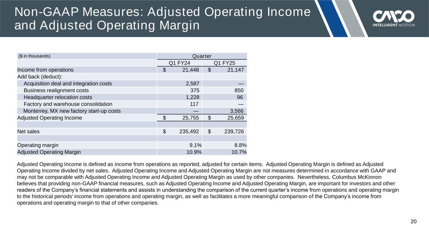 © 2024 COLUMBUS MCKINNON CORPORATION 19 ($ in thousands) Quarter Q1 FY24 Q1 FY25 Gross profit $ 86,649 $ 89,030 Add back (deduct): Business realignment costs 196 392 Monterrey, MX new factory start-up costs — 1,625 Adjusted Gross Profit $ 86,845 $ 91,047 Net sales $ 235,492 $ 239,726 Gross margin 36.8% 37.1% Adjusted Gross Margin 36.9% 38.0% Adjusted Gross Profit is defined as gross profit as reported, adjusted for certain items. Adjusted Gross Margin is defined as Adjusted Gross Profit divided by net sales. Adjusted Gross Profit and Adjusted Gross Margin are not measures determined in accordance with GAAP and may not be comparable with Adjusted Gross Profit and Adjusted Gross Margin as used by other companies. Nevertheless, Columbus McKinnon believes that providing non-GAAP financial measures, such as Adjusted Gross Profit and Adjusted Gross Margin, are important for investors and other readers of the Company’s financial statements and assists in understanding the comparison of the current quarter’s gross profit and gross profit margin to the historical periods' gross profit and gross margin, as well as facilitates a more meaningful comparison of the Company’s gross profit and gross profit margin to that of other companies. Non-GAAP Measures: Adjusted Gross Profit and Adjusted Gross Margin
