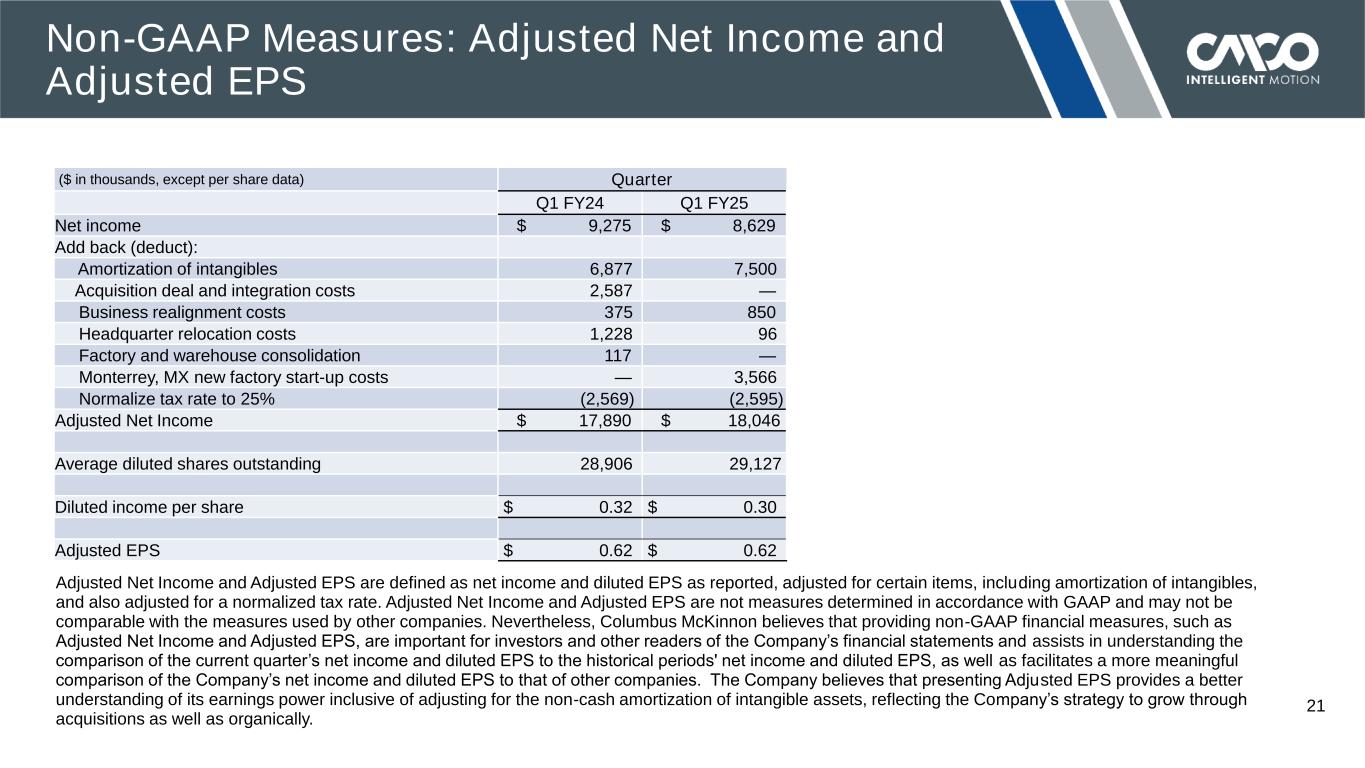 © 2024 COLUMBUS MCKINNON CORPORATION 20 Adjusted Operating Income is defined as income from operations as reported, adjusted for certain items. Adjusted Operating Margin is defined as Adjusted Operating Income divided by net sales. Adjusted Operating Income and Adjusted Operating Margin are not measures determined in accordance with GAAP and may not be comparable with Adjusted Operating Income and Adjusted Operating Margin as used by other companies. Nevertheless, Columbus McKinnon believes that providing non-GAAP financial measures, such as Adjusted Operating Income and Adjusted Operating Margin, are important for investors and other readers of the Company’s financial statements and assists in understanding the comparison of the current quarter’s income from operations and operating margin to the historical periods' income from operations and operating margin, as well as facilitates a more meaningful comparison of the Company’s income from operations and operating margin to that of other companies. ($ in thousands) Quarter Q1 FY24 Q1 FY25 Income from operations $ 21,448 $ 21,147 Add back (deduct): Acquisition deal and integration costs 2,587 — Business realignment costs 375 850 Headquarter relocation costs 1,228 96 Factory and warehouse consolidation 117 — Monterrey, MX new factory start-up costs — 3,566 Adjusted Operating Income $ 25,755 $ 25,659 Net sales $ 235,492 $ 239,726 Operating margin 9.1% 8.8% Adjusted Operating Margin 10.9% 10.7% Non-GAAP Measures: Adjusted Operating Income and Adjusted Operating Margin