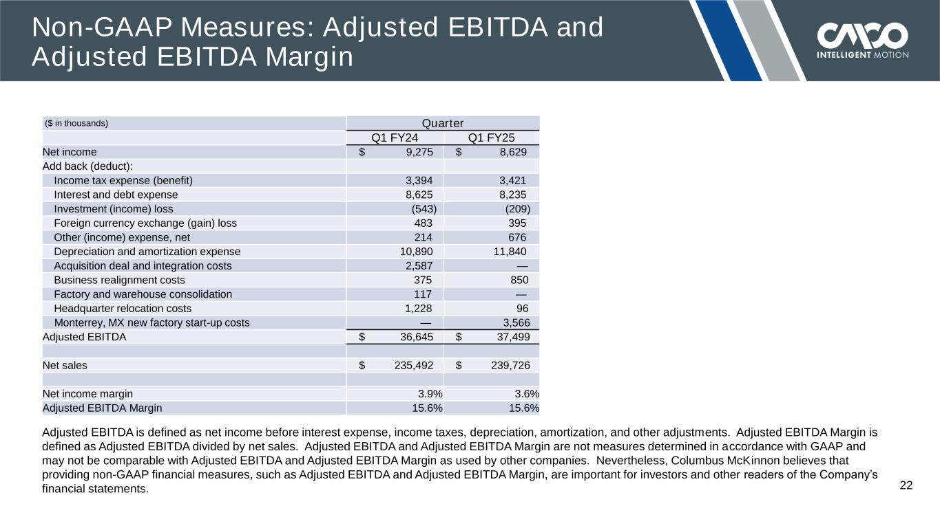 © 2024 COLUMBUS MCKINNON CORPORATION 21 Adjusted Net Income and Adjusted EPS are defined as net income and diluted EPS as reported, adjusted for certain items, including amortization of intangibles, and also adjusted for a normalized tax rate. Adjusted Net Income and Adjusted EPS are not measures determined in accordance with GAAP and may not be comparable with the measures used by other companies. Nevertheless, Columbus McKinnon believes that providing non-GAAP financial measures, such as Adjusted Net Income and Adjusted EPS, are important for investors and other readers of the Company’s financial statements and assists in understanding the comparison of the current quarter’s net income and diluted EPS to the historical periods' net income and diluted EPS, as well as facilitates a more meaningful comparison of the Company’s net income and diluted EPS to that of other companies. The Company believes that presenting Adjusted EPS provides a better understanding of its earnings power inclusive of adjusting for the non-cash amortization of intangible assets, reflecting the Company’s strategy to grow through acquisitions as well as organically. ($ in thousands, except per share data) Quarter Q1 FY24 Q1 FY25 Net income $ 9,275 $ 8,629 Add back (deduct): Amortization of intangibles 6,877 7,500 Acquisition deal and integration costs 2,587 — Business realignment costs 375 850 Headquarter relocation costs 1,228 96 Factory and warehouse consolidation 117 — Monterrey, MX new factory start-up costs — 3,566 Normalize tax rate to 25% (2,569) (2,595) Adjusted Net Income $ 17,890 $ 18,046 Average diluted shares outstanding 28,906 29,127 Diluted income per share $ 0.32 $ 0.30 Adjusted EPS $ 0.62 $ 0.62 Non-GAAP Measures: Adjusted Net Income and Adjusted EPS