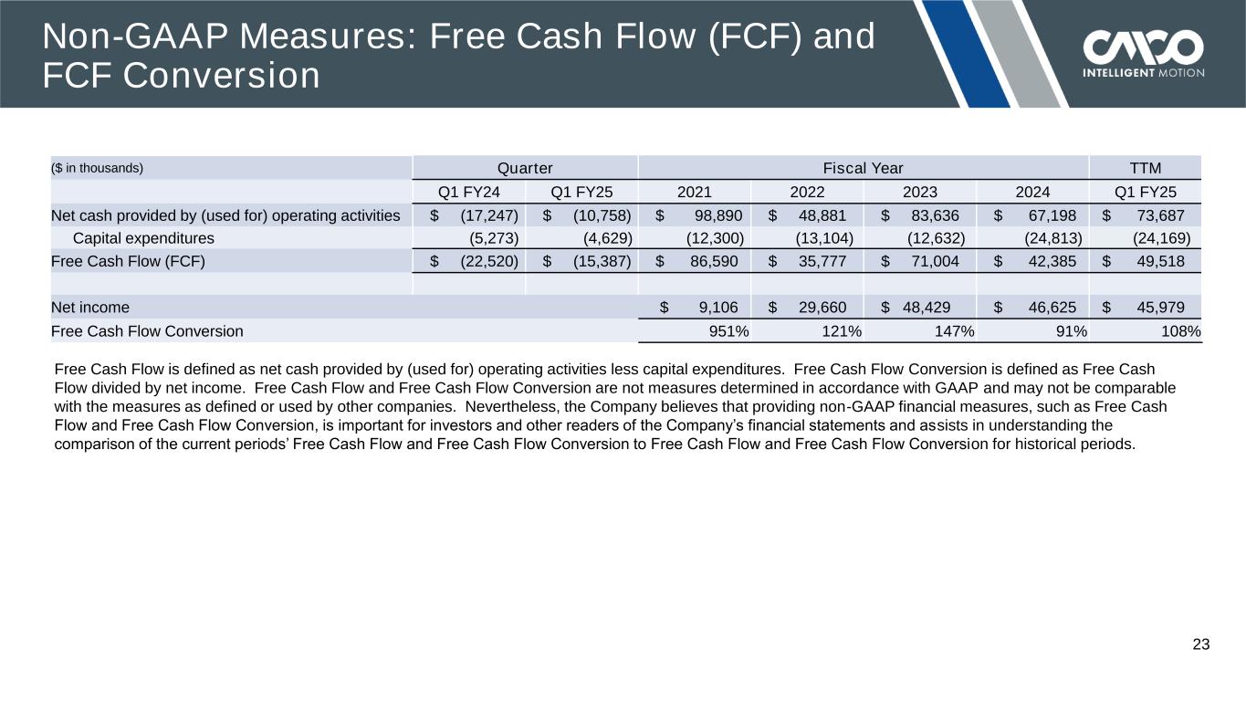 © 2024 COLUMBUS MCKINNON CORPORATION 22 Adjusted EBITDA is defined as net income before interest expense, income taxes, depreciation, amortization, and other adjustments. Adjusted EBITDA Margin is defined as Adjusted EBITDA divided by net sales. Adjusted EBITDA and Adjusted EBITDA Margin are not measures determined in accordance with GAAP and may not be comparable with Adjusted EBITDA and Adjusted EBITDA Margin as used by other companies. Nevertheless, Columbus McKinnon believes that providing non-GAAP financial measures, such as Adjusted EBITDA and Adjusted EBITDA Margin, are important for investors and other readers of the Company’s financial statements. ($ in thousands) Quarter Q1 FY24 Q1 FY25 Net income $ 9,275 $ 8,629 Add back (deduct): Income tax expense (benefit) 3,394 3,421 Interest and debt expense 8,625 8,235 Investment (income) loss (543) (209) Foreign currency exchange (gain) loss 483 395 Other (income) expense, net 214 676 Depreciation and amortization expense 10,890 11,840 Acquisition deal and integration costs 2,587 — Business realignment costs 375 850 Factory and warehouse consolidation 117 — Headquarter relocation costs 1,228 96 Monterrey, MX new factory start-up costs — 3,566 Adjusted EBITDA $ 36,645 $ 37,499 Net sales $ 235,492 $ 239,726 Net income margin 3.9% 3.6% Adjusted EBITDA Margin 15.6% 15.6% Non-GAAP Measures: Adjusted EBITDA and Adjusted EBITDA Margin