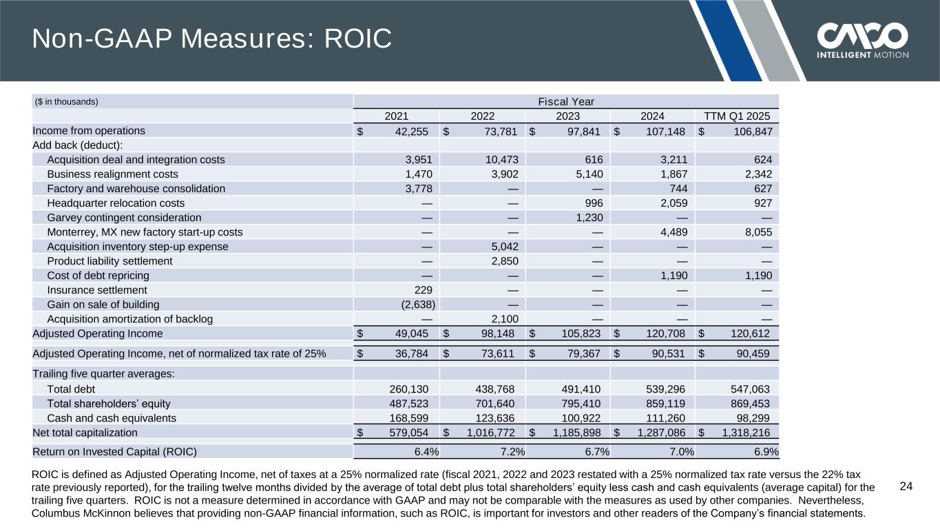 © 2024 COLUMBUS MCKINNON CORPORATION Free Cash Flow is defined as net cash provided by (used for) operating activities less capital expenditures. Free Cash Flow Conversion is defined as Free Cash Flow divided by net income. Free Cash Flow and Free Cash Flow Conversion are not measures determined in accordance with GAAP and may not be comparable with the measures as defined or used by other companies. Nevertheless, the Company believes that providing non-GAAP financial measures, such as Free Cash Flow and Free Cash Flow Conversion, is important for investors and other readers of the Company’s financial statements and assists in understanding the comparison of the current periods’ Free Cash Flow and Free Cash Flow Conversion to Free Cash Flow and Free Cash Flow Conversion for historical periods. 23 ($ in thousands) Quarter Fiscal Year TTM Q1 FY24 Q1 FY25 2021 2022 2023 2024 Q1 FY25 Net cash provided by (used for) operating activities $ (17,247) $ (10,758) $ 98,890 $ 48,881 $ 83,636 $ 67,198 $ 73,687 Capital expenditures (5,273) (4,629) (12,300) (13,104) (12,632) (24,813) (24,169) Free Cash Flow (FCF) $ (22,520) $ (15,387) $ 86,590 $ 35,777 $ 71,004 $ 42,385 $ 49,518 Net income $ 9,106 $ 29,660 $ 48,429 $ 46,625 $ 45,979 Free Cash Flow Conversion 951% 121% 147% 91% 108% Non-GAAP Measures: Free Cash Flow (FCF) and FCF Conversion