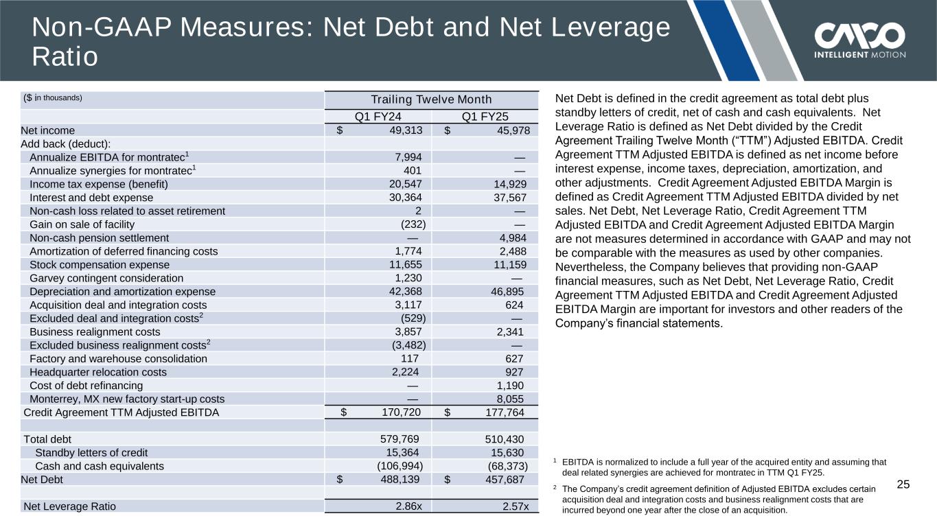 © 2024 COLUMBUS MCKINNON CORPORATION 24 ROIC is defined as Adjusted Operating Income, net of taxes at a 25% normalized rate (fiscal 2021, 2022 and 2023 restated with a 25% normalized tax rate versus the 22% tax rate previously reported), for the trailing twelve months divided by the average of total debt plus total shareholders’ equity less cash and cash equivalents (average capital) for the trailing five quarters. ROIC is not a measure determined in accordance with GAAP and may not be comparable with the measures as used by other companies. Nevertheless, Columbus McKinnon believes that providing non-GAAP financial information, such as ROIC, is important for investors and other readers of the Company’s financial statements. ($ in thousands) Fiscal Year 2021 2022 2023 2024 TTM Q1 2025 Income from operations $ 42,255 $ 73,781 $ 97,841 $ 107,148 $ 106,847 Add back (deduct): Acquisition deal and integration costs 3,951 10,473 616 3,211 624 Business realignment costs 1,470 3,902 5,140 1,867 2,342 Factory and warehouse consolidation 3,778 — — 744 627 Headquarter relocation costs — — 996 2,059 927 Garvey contingent consideration — — 1,230 — — Monterrey, MX new factory start-up costs — — — 4,489 8,055 Acquisition inventory step-up expense — 5,042 — — — Product liability settlement — 2,850 — — — Cost of debt repricing — — — 1,190 1,190 Insurance settlement 229 — — — — Gain on sale of building (2,638) — — — — Acquisition amortization of backlog — 2,100 — — — Adjusted Operating Income $ 49,045 $ 98,148 $ 105,823 $ 120,708 $ 120,612 Adjusted Operating Income, net of normalized tax rate of 25% $ 36,784 $ 73,611 $ 79,367 $ 90,531 $ 90,459 Trailing five quarter averages: Total debt 260,130 438,768 491,410 539,296 547,063 Total shareholders’ equity 487,523 701,640 795,410 859,119 869,453 Cash and cash equivalents 168,599 123,636 100,922 111,260 98,299 Net total capitalization $ 579,054 $ 1,016,772 $ 1,185,898 $ 1,287,086 $ 1,318,216 Return on Invested Capital (ROIC) 6.4% 7.2% 6.7% 7.0% 6.9% Non-GAAP Measures: ROIC