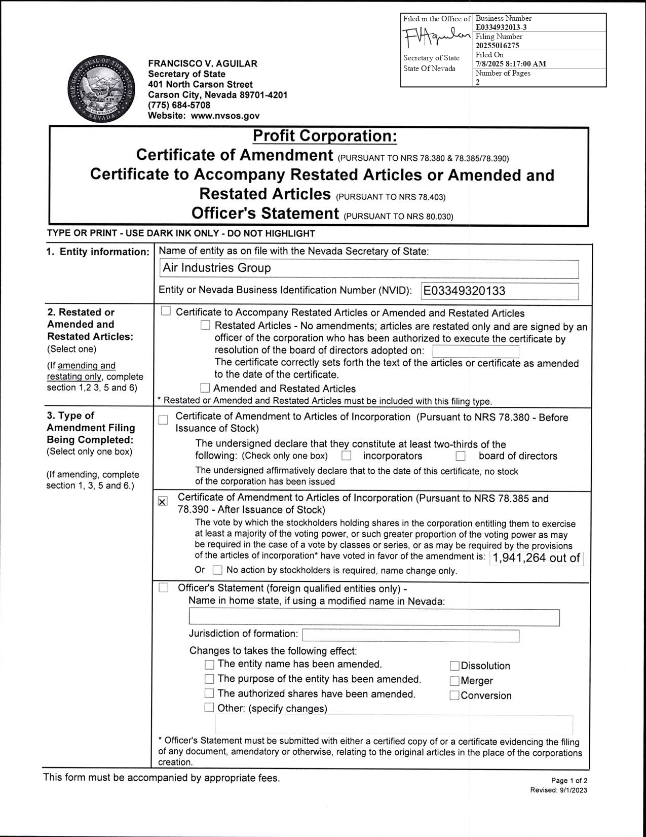 Business Entity - Filing Acknowledgement 07/08/2025 Work Order Item Number: Filing Number: Filing Type: Filing Date/Time: Filing Page(s): W2025070800623 - 4565959 20255016275 Amendment After Issuance of Stock 7/8/2025 8:17:00 AM 2 Indexed Entity Information: Entity ID: E0334932013 - 3 Entity Status: Active Entity Name: AIR INDUSTRIES GROUP Expiration Date: None Commercial Registered Agent CORPORATION SERVICE COMPANY* 112 NORTH CURRY STREET, Carson City, NV 89703, USA FRANCISCO V. AGUILAR Secretary of State RUBEN J. RODRIGUEZ Deputy Secretary for Southern Nevada 2250 Las Vegas Blvd North, Suite 400 North Las Vegas, NV 89030 Telephone (702) 486 - 2880 Fax (702) 486 - 2452 STATE OF NEVADA OFFICE OF THE SECRETARY OF STATE GABRIEL DI CHIARA Chief Deputy Secretary of State DEANNA L. REYNOLDS Deputy Secretary for Commercial Recordings 401 N. Carson Street Carson City, NV 89701 Telephone (775) 684 - 5708 Fax (775) 684 - 7141 The attached document(s) were filed with the Nevada Secretary of State, Commercial Recording Division. The filing date and time have been affixed to each document, indicating the date and time of filing. A filing number is also affixed and can be used to reference this document in the future. Respectfully, FRANCISCO V. AGUILAR Secretary of State Page 1 of 1 Commercial Recording 2250 Las Vegas Blvd North North Las Vegas, NV 89030 401 N. Carson Street Carson City, NV 89701 1 State of Nevada Way Las Vegas, NV 89119