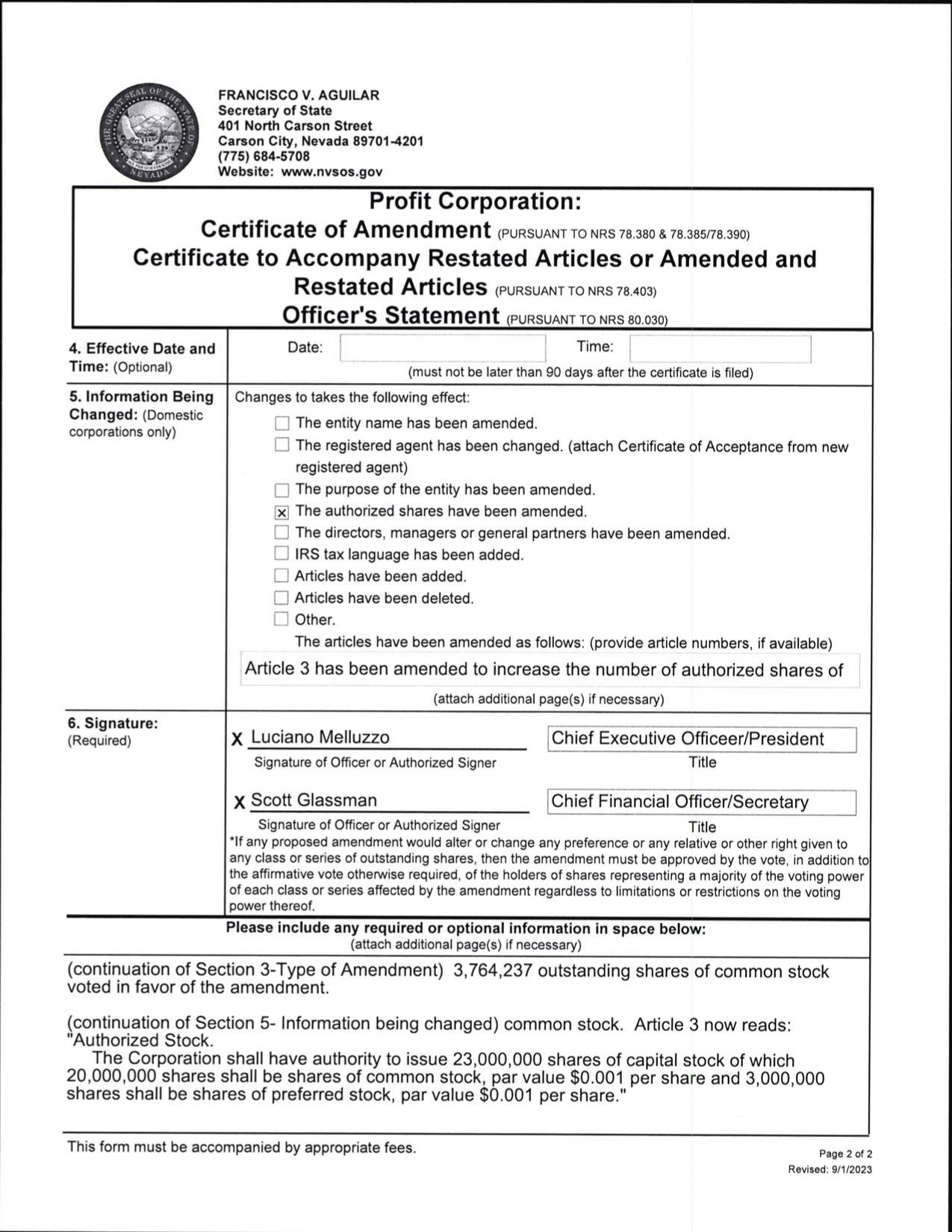 FRANCISCO V. AGUILAR Secretary of State 401 North Carson Street • Carson City, N9vada 89701 - 4201 (775) 684 - 570B Website: w ww.nvsos.gov Profit Corporation: Certificate of Amendment ‹PURSUANT TONRS 78.380 & 78 385/78.390) Certificate to Accompany Restated Articles or Amended and Restated Articles ‹PURSUANT TO NRS 78 403) OVicer's Statement Date: unsuAm zONRS 80.030) Time: 4. Effective Oate and Time: (Optional) (must not be later than 90 days after the certificate is filed) Changes to takes the following effect: - " The entity name has been amended, The registered agent has been changed. (attach Certificate of Acceptance from new registered agent) i The purpose of the entity has been amended. ”x| The authorized shares have been amended. ”” The directors, managers or general partners have been amended. i:. . IRS tax language has been added. Articles have been added. Anicles have been deleted. Other. The articles have been amended as follows: (provide article numbers, if available) Article 3 has been amended to increase the number of authorized shares of (attach additional page(s) if necessary) 5. Information Being Changed: (Domestic corporations only) 6. Signature: (ReqUired) x Luciano Melluzzo Signature of Officer or Authorized Signer , Chie Executive Officeer/President Title x Scott Glassman Signature of Officer or Authorized Signer Chief Financial Officer/Secretary Title ”If any proposed amendment would alter or change any preference or any relative or other right given to any class or s gries of outstanding shares, then the amendment must be approved by the vote, in addition to the affirmative vote otherwise required, of the holders of shares representing a majority of the voting power of each class or series affected by the amendment regardless to limitations or restrictions on the voting power thereof. Please include any required or optional information in spaCe below: (attach additional page(s} if necessary} (continuation of Section 3 - Type of Amendment) 3,764,237 outstanding shares of common stock voted in favor of the amendment. (continuation of Section 5 - Information being changed) common stock. Article 3 now reads: "A u thorized Stock. The Corporation shall have authority to issue 23,000,000 shares of capital stock of which 20,000,000 shares shall be shares of common stock, par value $0.001 per share and 3,000,000 shares shall be shares of preferred stock, par value $0.001 per share." This form must be accompanied by appropriate fees. Page 2 or 2 Revised: 9/1/2023