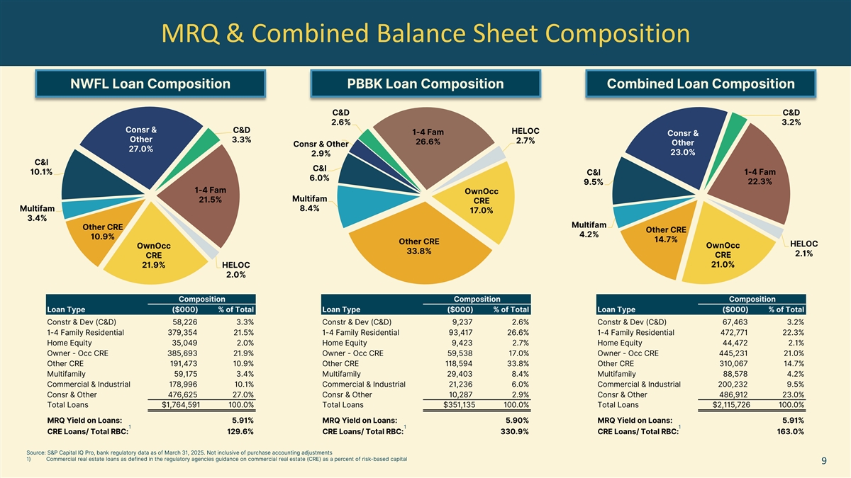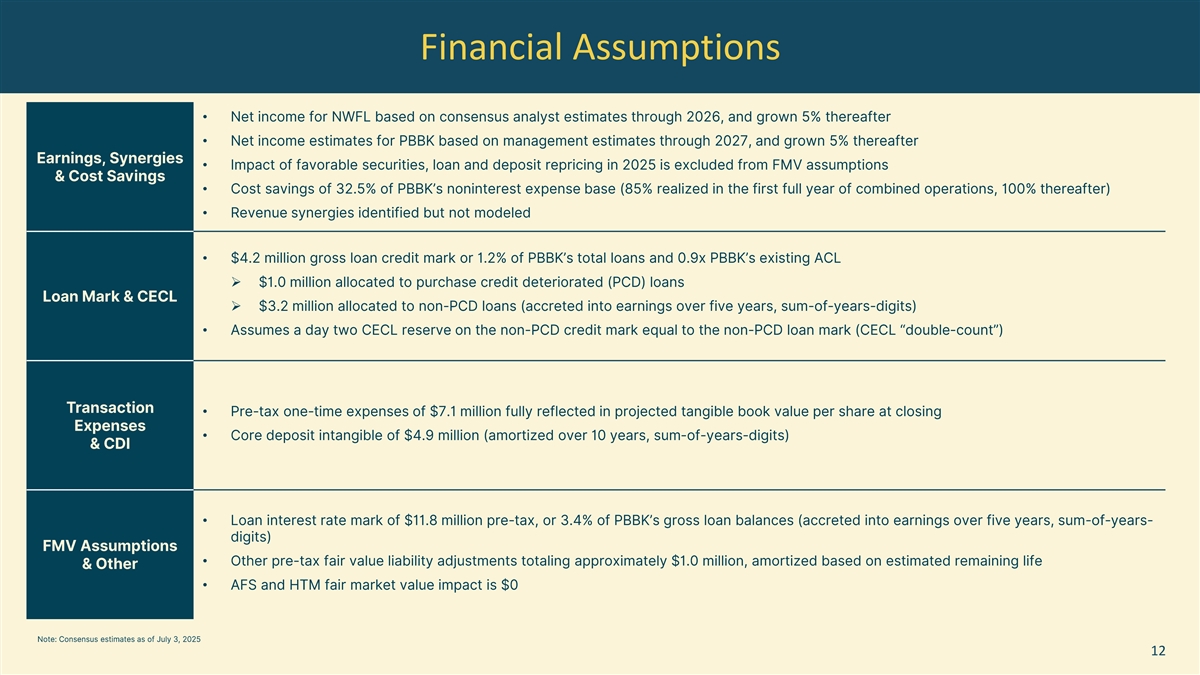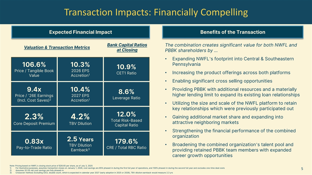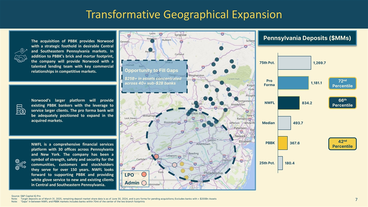 Transaction Impacts: Financially Compelling Expected Financial Impact Benefits of the Transaction • Expanding NWFL’s footprint into Central & Southeastern Pennsylvania 106.6% 10.3% 10.9% Price / Tangible Book 2026 EPS • Increasing the product offerings across both platforms CET1 Ratio 1 Value Accretion • Enabling significant cross selling opportunities • Providing PBBK with additional resources and a materially 9.4x 10.4% 8.6% higher lending limit to expand its existing loan relationships Price / ’26E Earnings 2027 EPS Leverage Ratio 2 1 (Incl. Cost Saves) Accretion • Utilizing the size and scale of the NWFL platform to retain key relationships which were previously participated out 12.0% • Gaining additional market share and expanding into 2.3% 4.2% Total Risk-Based attractive neighboring markets Core Deposit Premium TBV Dilution Capital Ratio • Strengthening the financial performance of the combined organization 2.5 Years 0.83x 179.6% • Broadening the combined organization’s talent pool and TBV Dilution Pay-to-Trade Ratio CRE / Total RBC Ratio 3 Earnback providing retained PBBK team members with expanded career growth opportunities Note: Pricing based on NWFL's closing stock price of $26.65 per share, as of July 3, 2025 1) For illustrative purposes, assumes transaction closes on January 1, 2026, cost savings are 85% phased-in during the first full year of operations, and 100% phased-in during the second full year and excludes one-time deal costs 5 2) Assumes 32.5% net cost savings are fully phased-in 3) Crossover method; Excluding CECL double count, which is expected in calendar year 2027 (early adoption in 2025 or 2026), TBV dilution earnback would measure 2.3 yrs