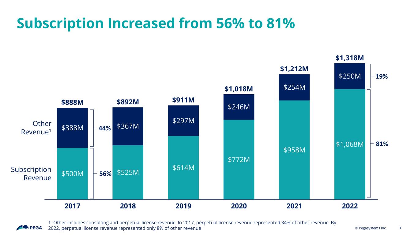 © Pegasystems Inc. 6 SUBSCRIPTION TRANSITION TIMELINE 2017 2023 To…From… Recurring More Predictable Rule of 40 Driven Perpetual Less Predictable Lagging Growth & Margins Transition to Subscription Wrapping up in Mid 2023