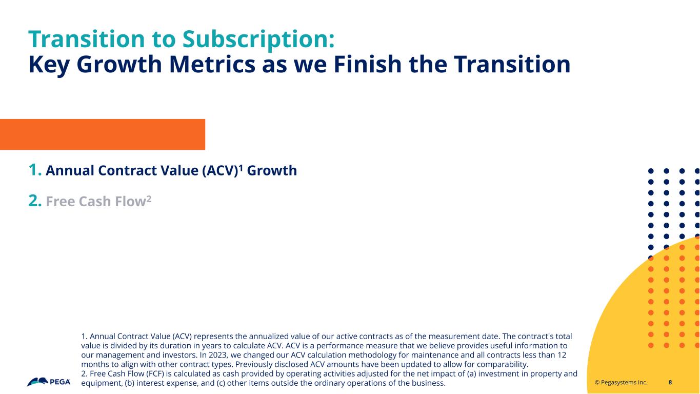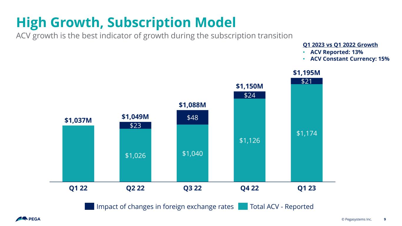 8 1. Annual Contract Value (ACV)1 Growth 2. Free Cash Flow2 © Pegasystems Inc. 1. Annual Contract Value (ACV) represents the annualized value of our active contracts as of the measurement date. The contract's total value is divided by its duration in years to calculate ACV. ACV is a performance measure that we believe provides useful information to our management and investors. In 2023, we changed our ACV calculation methodology for maintenance and all contracts less than 12 months to align with other contract types. Previously disclosed ACV amounts have been updated to allow for comparability. 2. Free Cash Flow (FCF) is calculated as cash provided by operating activities adjusted for the net impact of (a) investment in property and equipment, (b) interest expense, and (c) other items outside the ordinary operations of the business. Transition to Subscription: Key Growth Metrics as we Finish the Transition