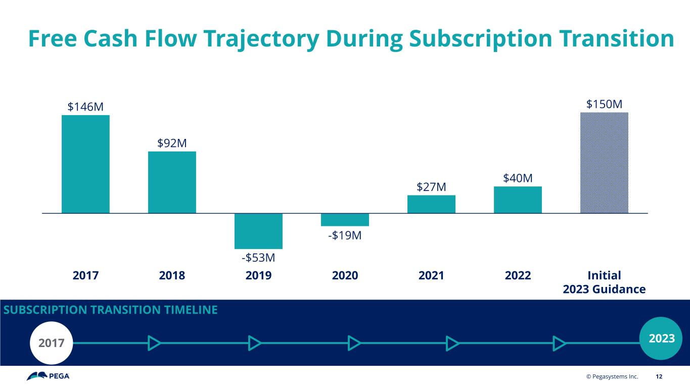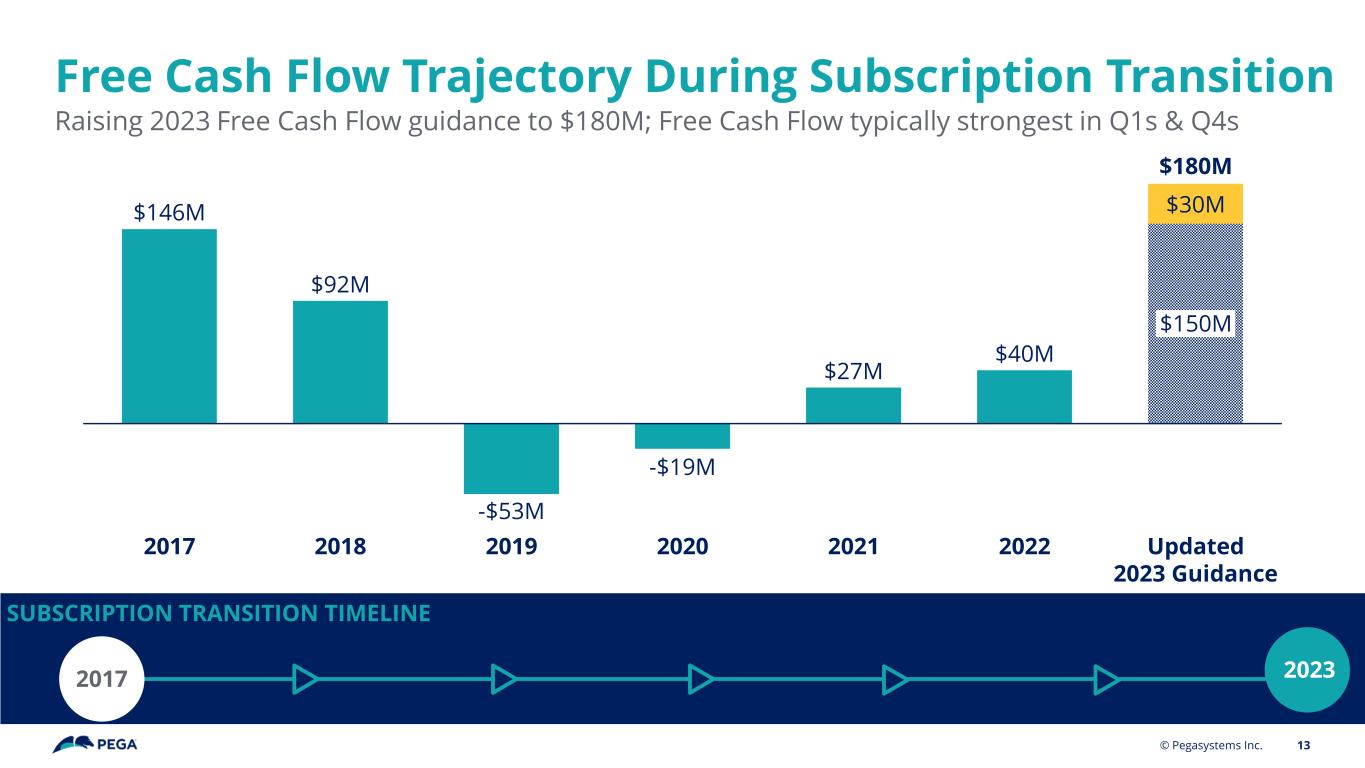 Free Cash Flow Trajectory During Subscription Transition © Pegasystems Inc. 12 SUBSCRIPTION TRANSITION TIMELINE 20232017 $146M $92M -$53M -$19M $27M $40M $150M Initial 2023 Guidance 20182017 2019 2020 20222021