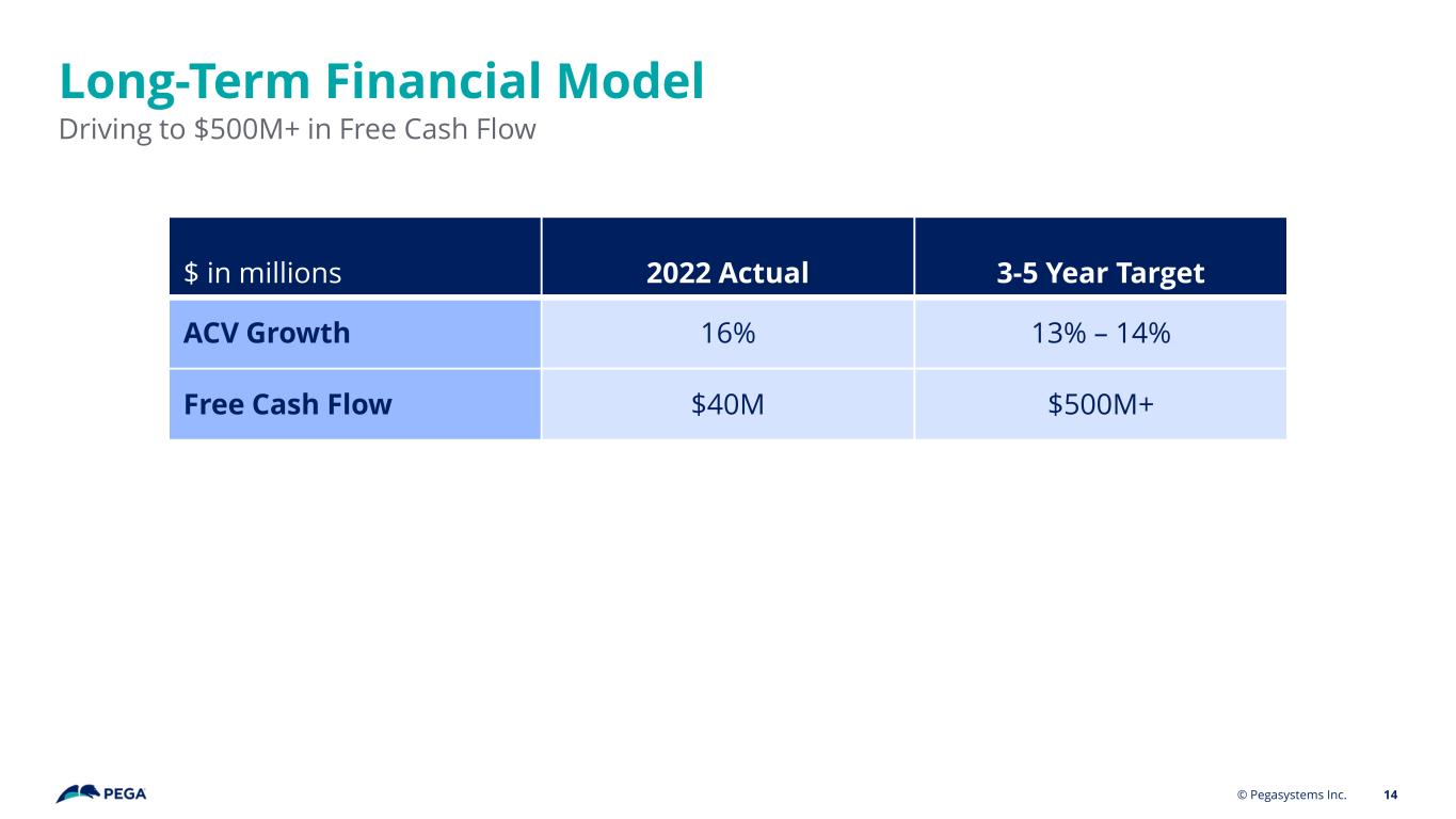 Free Cash Flow Trajectory During Subscription Transition Raising 2023 Free Cash Flow guidance to $180M; Free Cash Flow typically strongest in Q1s & Q4s © Pegasystems Inc. 13 SUBSCRIPTION TRANSITION TIMELINE 20232017 $146M $92M -$53M -$19M $27M $40M $30M $150M 20222017 20212018 2019 2020 Updated 2023 Guidance $180M