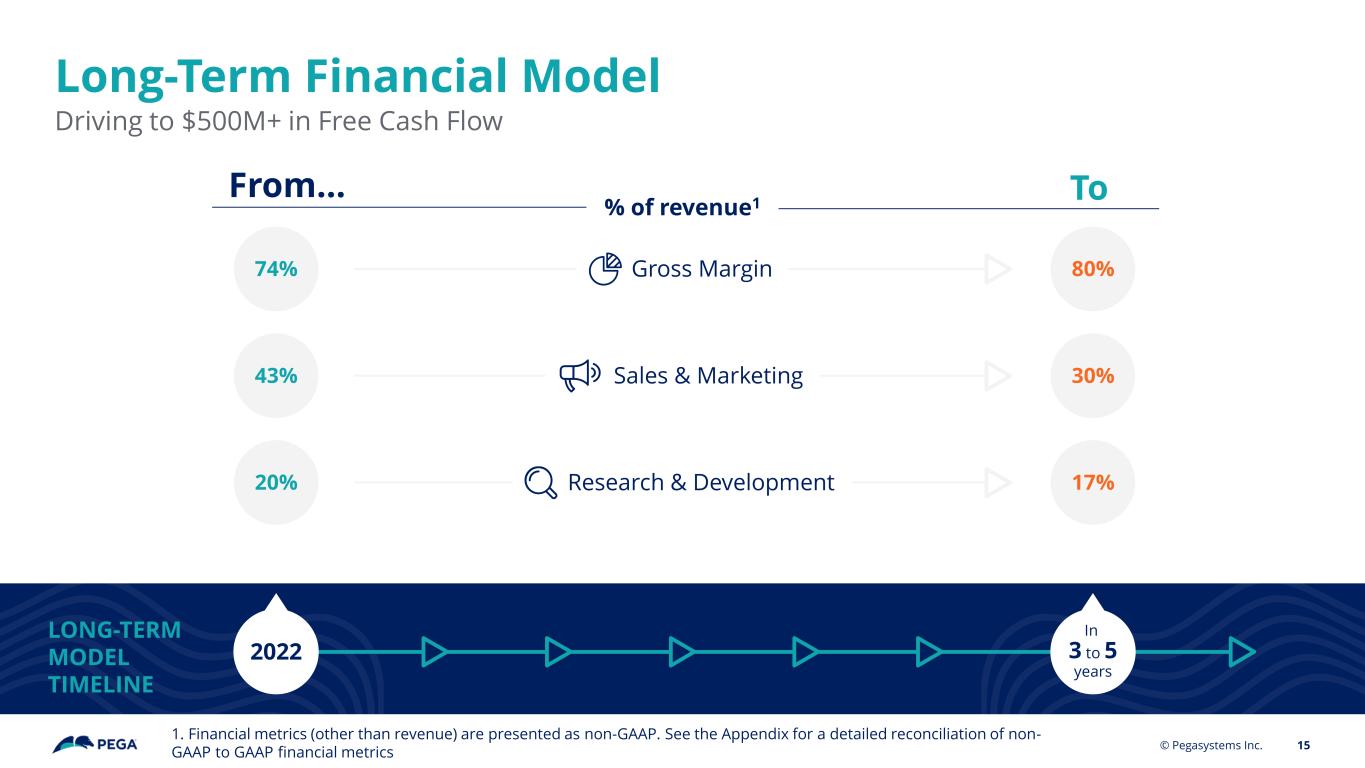 Long-Term Financial Model Driving to $500M+ in Free Cash Flow $ in millions 2022 Actual 3-5 Year Target ACV Growth 16% 13% – 14% Free Cash Flow $40M $500M+ 14© Pegasystems Inc.