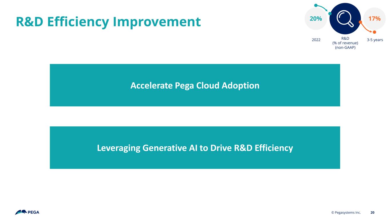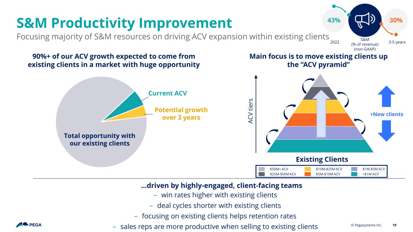 Total opportunity with our existing clients Current ACV Potential growth over 3 years 90%+ of our ACV growth expected to come from existing clients in a market with huge opportunity +New clients A C V t ie rs Main focus is to move existing clients up the “ACV pyramid” – win rates higher with existing clients – deal cycles shorter with existing clients – focusing on existing clients helps retention rates – sales reps are more productive when selling to existing clients <$1M ACV $50M+ ACV $25M-$50M ACV $10M-$25M ACV $5M-$10M ACV $1M-$5M ACV 30%43%S&M Productivity Improvement Focusing majority of S&M resources on driving ACV expansion within existing clients S&M (% of revenue) (non-GAAP) 2022 3-5 years 19© Pegasystems Inc. Existing Clients …driven by highly-engaged, client-facing teams