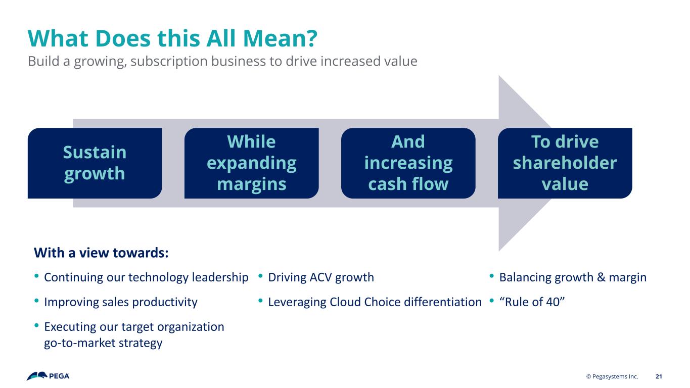 What Does this All Mean? Build a growing, subscription business to drive increased value 21 • Continuing our technology leadership • Improving sales productivity • Executing our target organization go-to-market strategy • Driving ACV growth • Leveraging Cloud Choice differentiation • Balancing growth & margin • “Rule of 40” Sustain growth While expanding margins And increasing cash flow To drive shareholder value © Pegasystems Inc. With a view towards: © Pegasystems Inc.