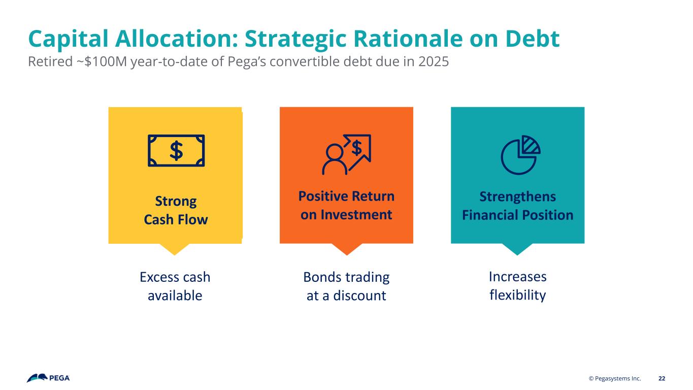 Excess cash available Bonds trading at a discount Capital Allocation: Strategic Rationale on Debt Retired ~$100M year-to-date of Pega’s convertible debt due in 2025 22 Strong Cash Flow Positive Return on Investment Strengthens Financial Position Increases flexibility © Pegasystems Inc.