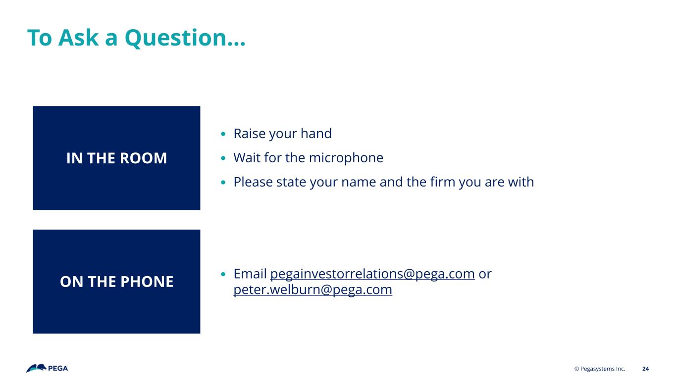 To Ask a Question… 24 IN THE ROOM ON THE PHONE • Raise your hand • Wait for the microphone • Please state your name and the firm you are with • Email pegainvestorrelations@pega.com or peter.welburn@pega.com © Pegasystems Inc.