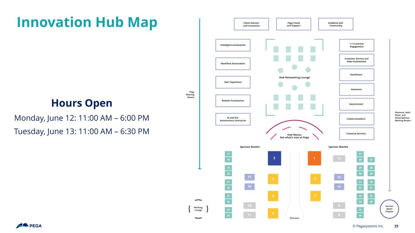 25 Hours Open Monday, June 12: 11:00 AM – 6:00 PM Tuesday, June 13: 11:00 AM – 6:30 PM Innovation Hub Map © Pegasystems Inc.