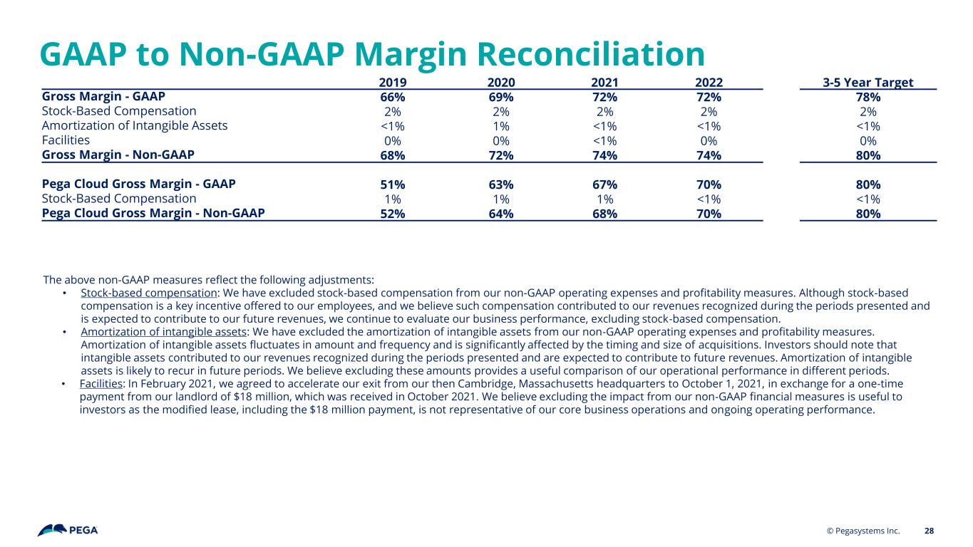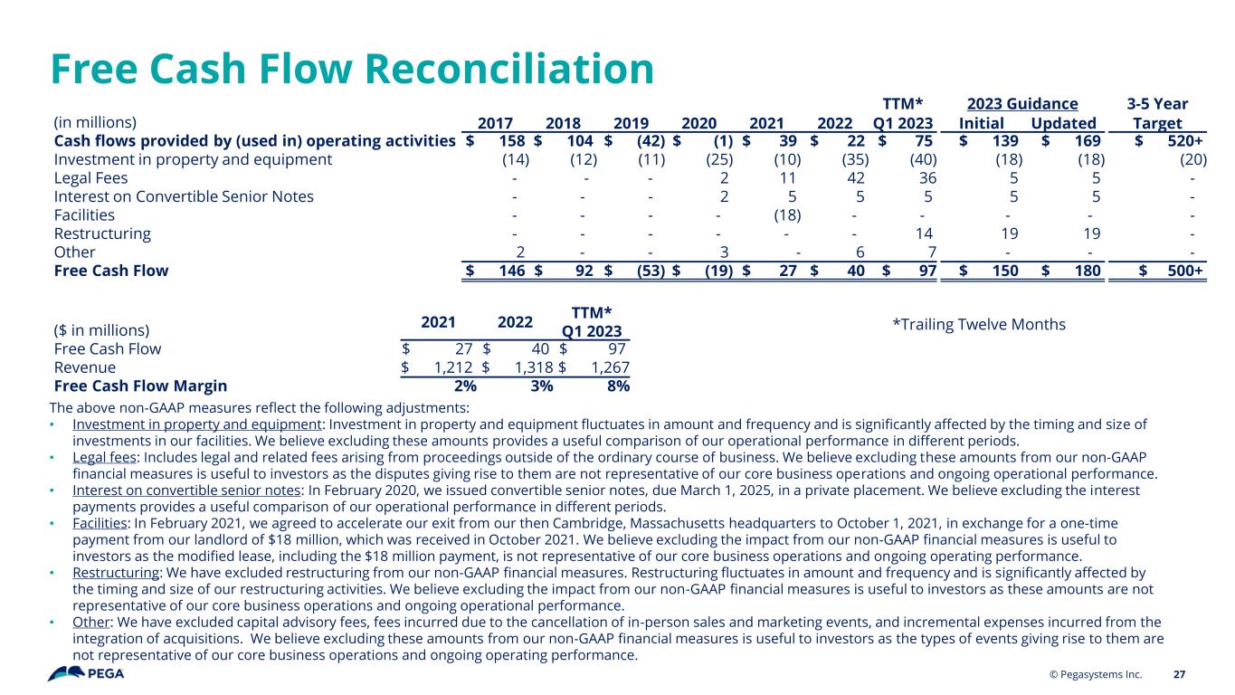 Free Cash Flow Reconciliation 27 TTM* 2023 Guidance 3-5 Year (in millions) 2017 2018 2019 2020 2021 2022 Q1 2023 Initial Updated Target Cash flows provided by (used in) operating activities $ 158 $ 104 $ (42) $ (1) $ 39 $ 22 $ 75 $ 139 $ 169 $ 520+ Investment in property and equipment (14) (12) (11) (25) (10) (35) (40) (18) (18) (20) Legal Fees - - - 2 11 42 36 5 5 - Interest on Convertible Senior Notes - - - 2 5 5 5 5 5 - Facilities - - - - (18) - - - - - Restructuring - - - - - - 14 19 19 - Other 2 - - 3 - 6 7 - - - Free Cash Flow $ 146 $ 92 $ (53) $ (19) $ 27 $ 40 $ 97 $ 150 $ 180 $ 500+ The above non-GAAP measures reflect the following adjustments: • Investment in property and equipment: Investment in property and equipment fluctuates in amount and frequency and is significantly affected by the timing and size of investments in our facilities. We believe excluding these amounts provides a useful comparison of our operational performance in different periods. • Legal fees: Includes legal and related fees arising from proceedings outside of the ordinary course of business. We believe excluding these amounts from our non-GAAP financial measures is useful to investors as the disputes giving rise to them are not representative of our core business operations and ongoing operational performance. • Interest on convertible senior notes: In February 2020, we issued convertible senior notes, due March 1, 2025, in a private placement. We believe excluding the interest payments provides a useful comparison of our operational performance in different periods. • Facilities: In February 2021, we agreed to accelerate our exit from our then Cambridge, Massachusetts headquarters to October 1, 2021, in exchange for a one-time payment from our landlord of $18 million, which was received in October 2021. We believe excluding the impact from our non-GAAP financial measures is useful to investors as the modified lease, including the $18 million payment, is not representative of our core business operations and ongoing operating performance. • Restructuring: We have excluded restructuring from our non-GAAP financial measures. Restructuring fluctuates in amount and frequency and is significantly affected by the timing and size of our restructuring activities. We believe excluding the impact from our non-GAAP financial measures is useful to investors as these amounts are not representative of our core business operations and ongoing operational performance. • Other: We have excluded capital advisory fees, fees incurred due to the cancellation of in-person sales and marketing events, and incremental expenses incurred from the integration of acquisitions. We believe excluding these amounts from our non-GAAP financial measures is useful to investors as the types of events giving rise to them are not representative of our core business operations and ongoing operating performance. © Pegasystems Inc. ($ in millions) 2021 2022 TTM* Q1 2023 Free Cash Flow $ 27 $ 40 $ 97 Revenue $ 1,212 $ 1,318 $ 1,267 Free Cash Flow Margin 2% 3% 8% *Trailing Twelve Months