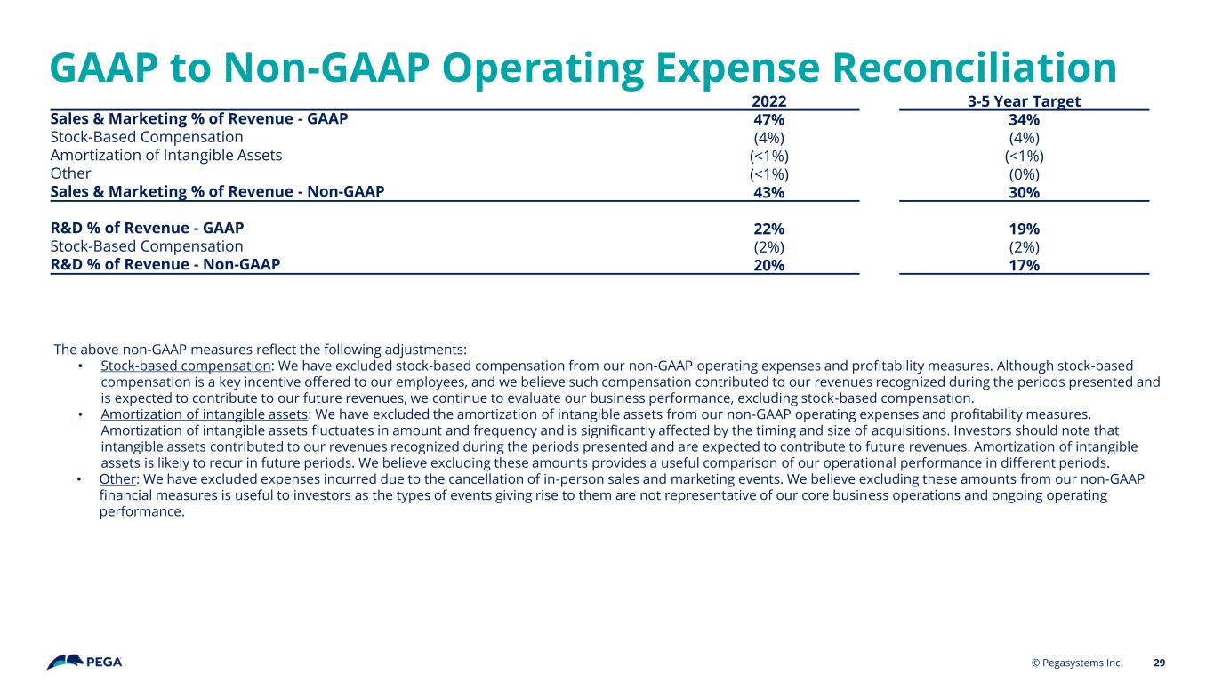 GAAP to Non-GAAP Margin Reconciliation 28 2019 2020 2021 2022 3-5 Year Target Gross Margin - GAAP 66% 69% 72% 72% 78% Stock-Based Compensation 2% 2% 2% 2% 2% Amortization of Intangible Assets <1% 1% <1% <1% <1% Facilities 0% 0% <1% 0% 0% Gross Margin - Non-GAAP 68% 72% 74% 74% 80% Pega Cloud Gross Margin - GAAP 51% 63% 67% 70% 80% Stock-Based Compensation 1% 1% 1% <1% <1% Pega Cloud Gross Margin - Non-GAAP 52% 64% 68% 70% 80% The above non-GAAP measures reflect the following adjustments: • Stock-based compensation: We have excluded stock-based compensation from our non-GAAP operating expenses and profitability measures. Although stock-based compensation is a key incentive offered to our employees, and we believe such compensation contributed to our revenues recognized during the periods presented and is expected to contribute to our future revenues, we continue to evaluate our business performance, excluding stock-based compensation. • Amortization of intangible assets: We have excluded the amortization of intangible assets from our non-GAAP operating expenses and profitability measures. Amortization of intangible assets fluctuates in amount and frequency and is significantly affected by the timing and size of acquisitions. Investors should note that intangible assets contributed to our revenues recognized during the periods presented and are expected to contribute to future revenues. Amortization of intangible assets is likely to recur in future periods. We believe excluding these amounts provides a useful comparison of our operational performance in different periods. • Facilities: In February 2021, we agreed to accelerate our exit from our then Cambridge, Massachusetts headquarters to October 1, 2021, in exchange for a one-time payment from our landlord of $18 million, which was received in October 2021. We believe excluding the impact from our non-GAAP financial measures is useful to investors as the modified lease, including the $18 million payment, is not representative of our core business operations and ongoing operating performance. © Pegasystems Inc.