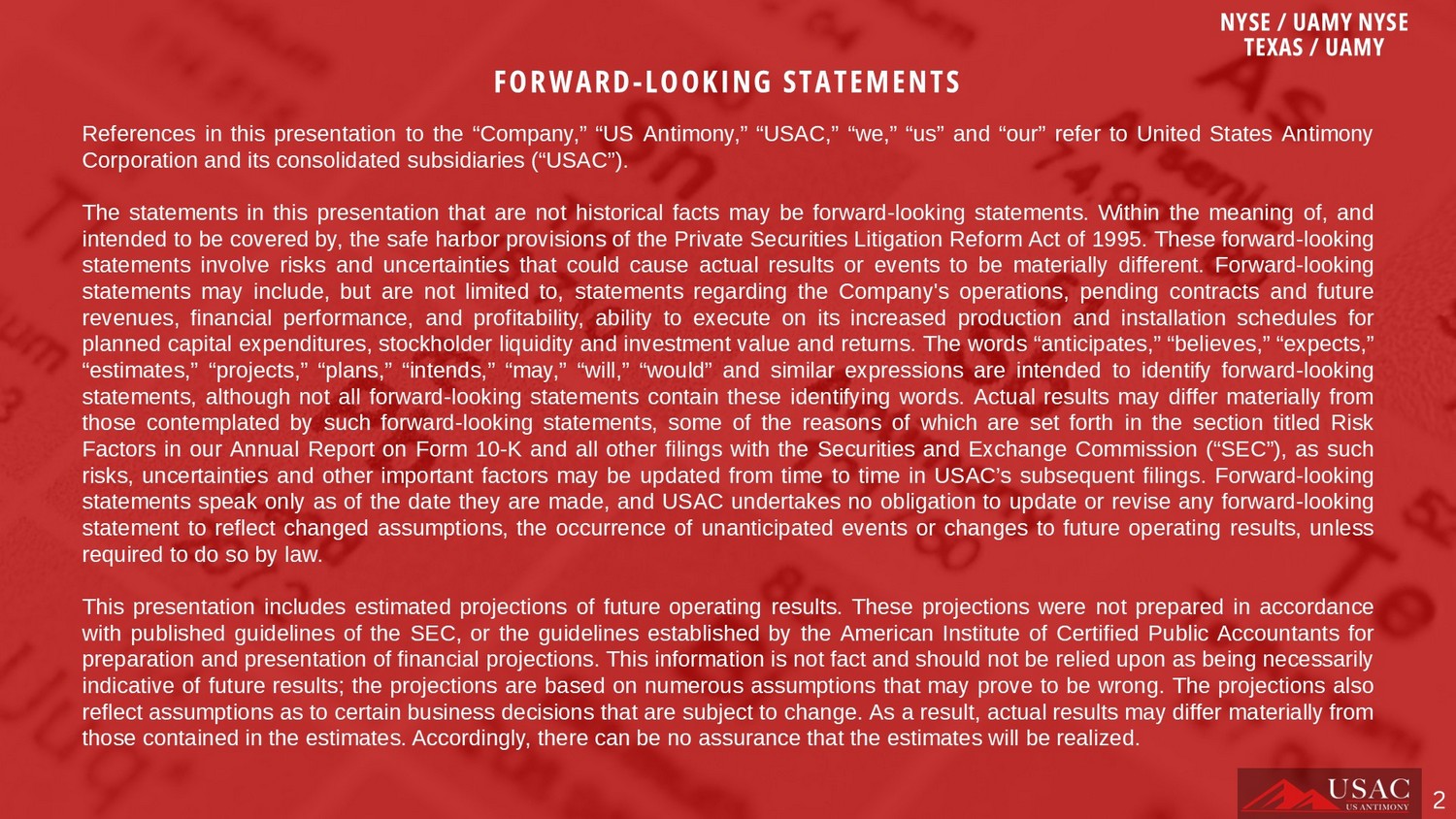 References in this presentation to the “Company,” “US Antimony,” “USAC,” “we,” “us” and “our” refer to United States Antimony Corporation and its consolidated subsidiaries (“USAC”) . The statements in this presentation that are not historical facts may be forward - looking statements . Within the meaning of, and intended to be covered by, the safe harbor provisions of the Private Securities Litigation Reform Act of 1995 . These forward - looking statements involve risks and uncertainties that could cause actual results or events to be materially different . Forward - looking statements may include, but are not limited to, statements regarding the Company's operations, pending contracts and future revenues, financial performance, and profitability, ability to execute on its increased production and installation schedules for planned capital expenditures, stockholder liquidity and investment value and returns . The words “anticipates,” “believes,” “expects,” “estimates,” “projects,” “plans,” “intends,” “may,” “will,” “would” and similar expressions are intended to identify forward - looking statements, although not all forward - looking statements contain these identifying words . Actual results may differ materially from those contemplated by such forward - looking statements, some of the reasons of which are set forth in the section titled Risk Factors in our Annual Report on Form 10 - K and all other filings with the Securities and Exchange Commission (“SEC”), as such risks, uncertainties and other important factors may be updated from time to time in USAC’s subsequent filings . Forward - looking statements speak only as of the date they are made, and USAC undertakes no obligation to update or revise any forward - looking statement to reflect changed assumptions, the occurrence of unanticipated events or changes to future operating results, unless required to do so by law . This presentation includes estimated projections of future operating results . These projections were not prepared in accordance with published guidelines of the SEC, or the guidelines established by the American Institute of Certified Public Accountants for preparation and presentation of financial projections . This information is not fact and should not be relied upon as being necessarily indicative of future results ; the projections are based on numerous assumptions that may prove to be wrong . The projections also reflect assumptions as to certain business decisions that are subject to change . As a result, actual results may differ materially from those contained in the estimates . Accordingly, there can be no assurance that the estimates will be realized . FORWARD - LOOKING STATEMENTS 2 NYSE / UAMY NYSE TEXAS / UAMY
