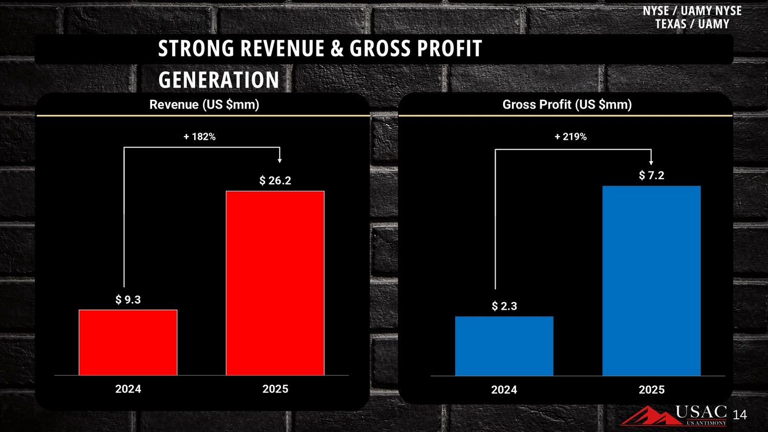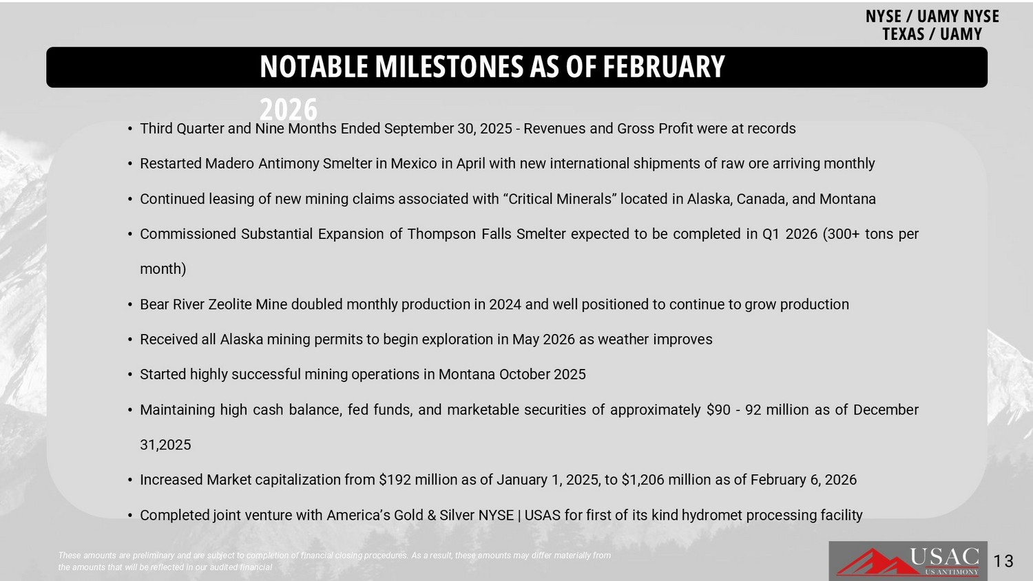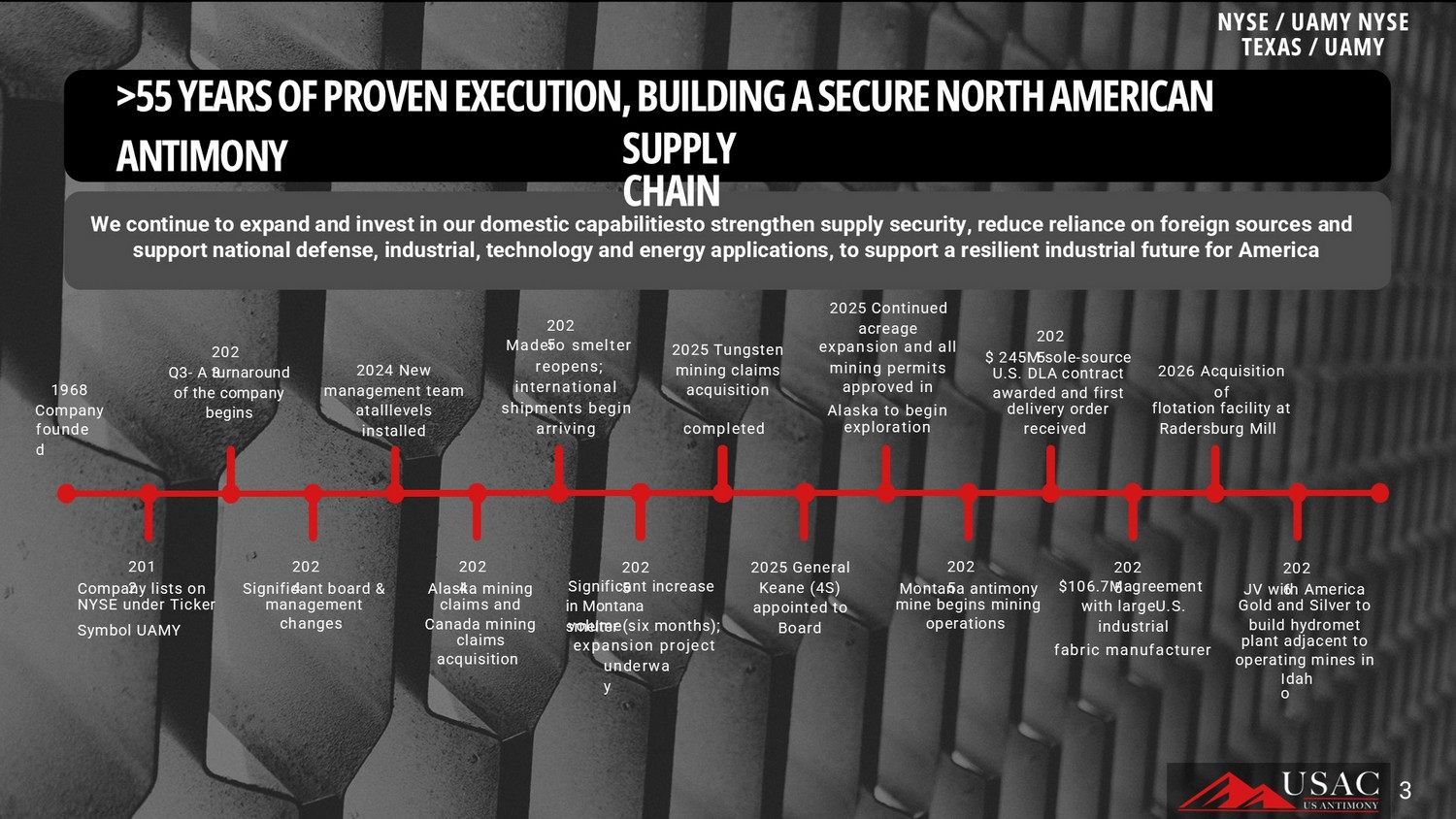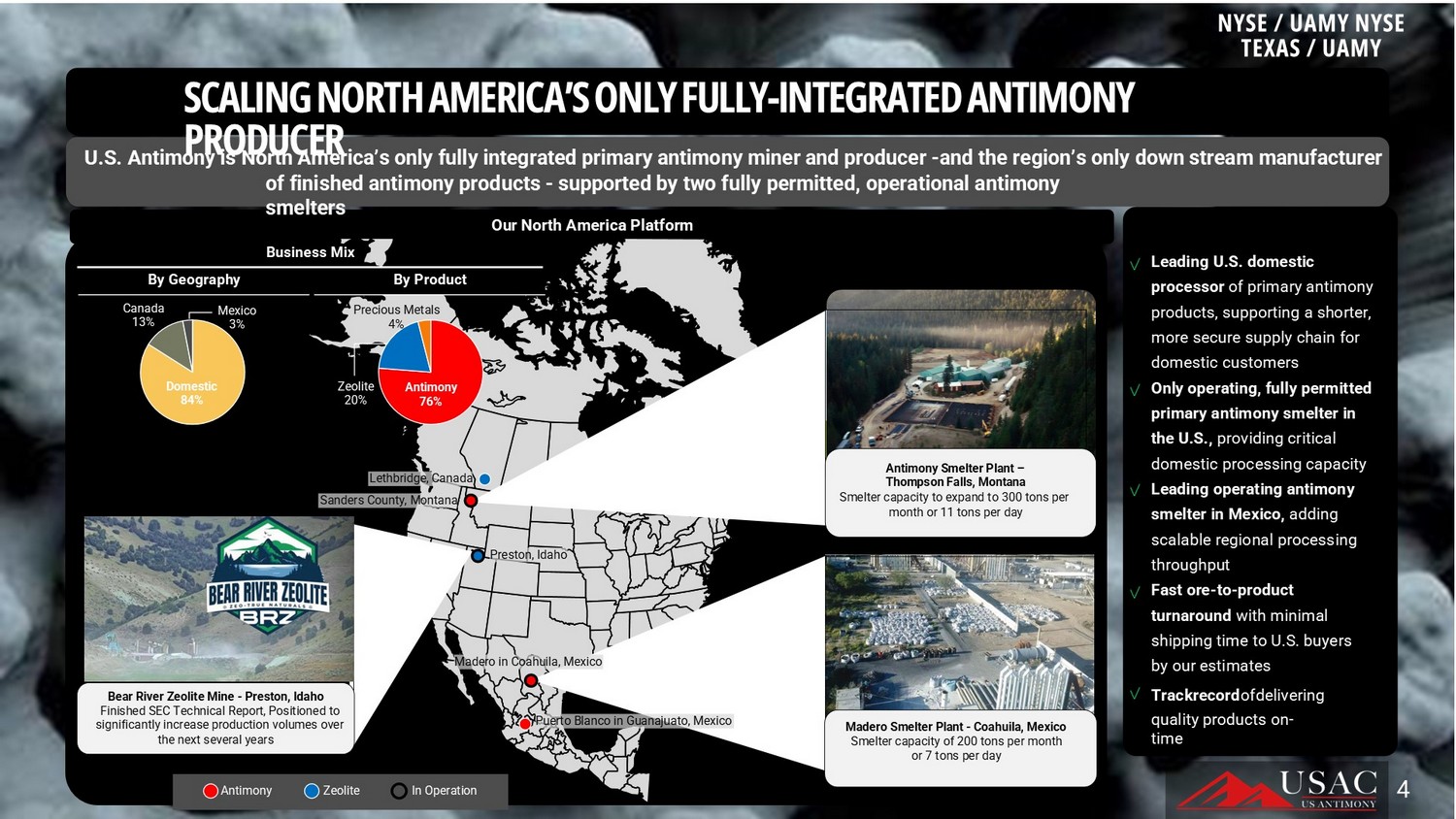 3 1968 Company founde d 201 2 Company lists on NYSE under Ticker Symbol UAMY 202 3 Q3 - A turnaround of the company begins 202 4 Significant board & management changes 2024 New management team atalllevels installed 202 4 Alaska mining claims and Canada mining claims acquisition 202 5 Madero smelter reopens; international shipments begin arriving 202 5 Significant increase in Montana smelter volume(six months); expansion project underwa y 2025 Tungsten mining claims acquisition completed 2025 General Keane (4S) appointed to Board 2025 Continued acreage expansion and all mining permits approved in Alaska to begin exploration 202 5 Montana antimony mine begins mining operations 202 5 $ 245M sole - source U.S. DLA contract awarded and first delivery order received 202 5 $106.7Magreement with largeU.S. industrial fabric manufacturer 2026 Acquisition of flotation facility at Radersburg Mill 202 6 JV with America Gold and Silver to build hydromet plant adjacent to operating mines in Idah o NYSE / UAMY NYSE TEXAS / UAMY 3 >55 YEARS OF PROVEN EXECUTION, BUILDING A SECURE NORTH AMERICAN ANTIMONY SUPPLY CHAIN We continue to expand and invest in our domestic capabilitiesto strengthen supply security, reduce reliance on foreign source s a nd support national defense, industrial, technology and energy applications, to support a resilient industrial future for Americ a