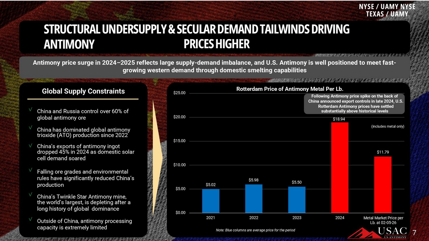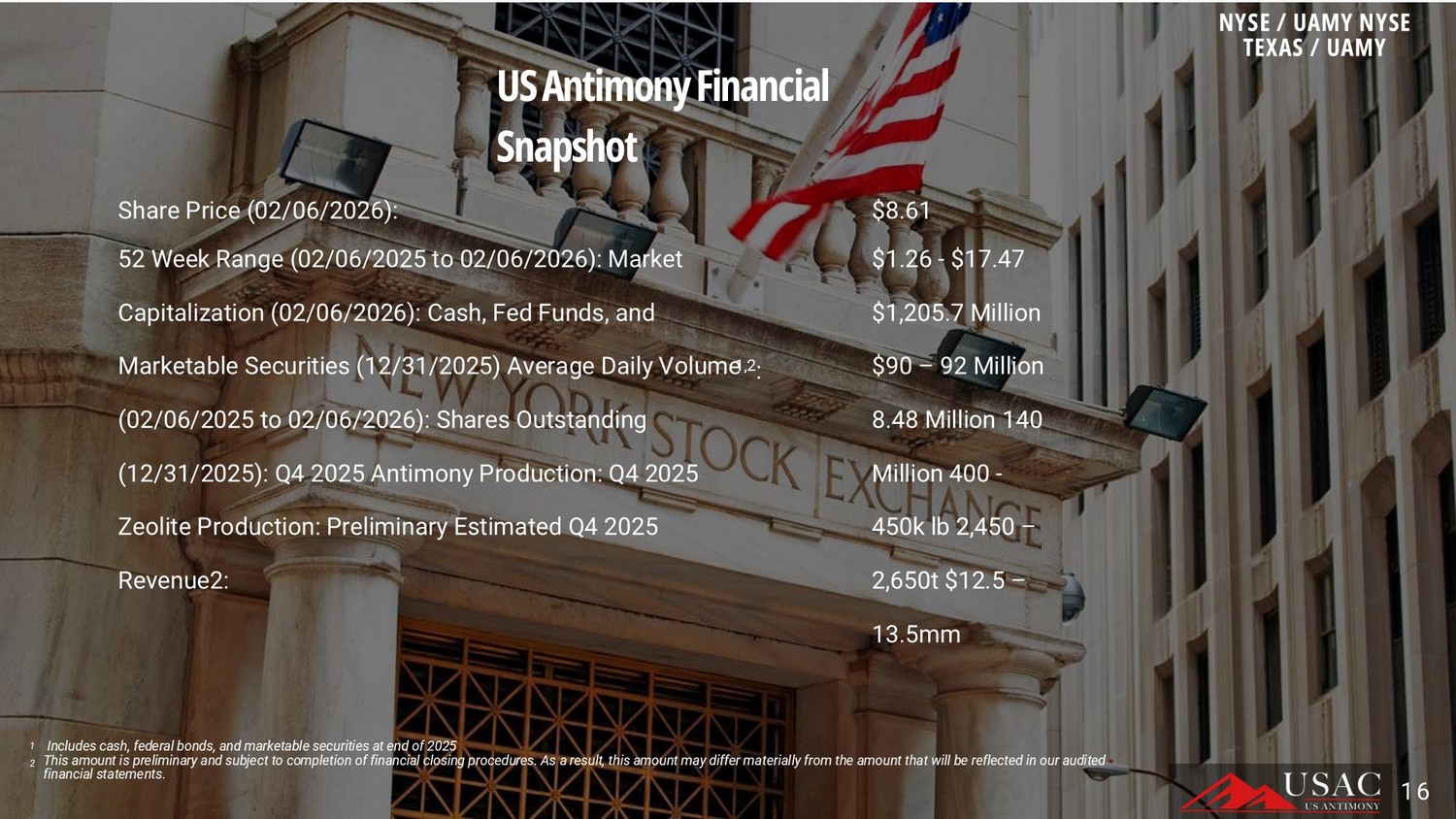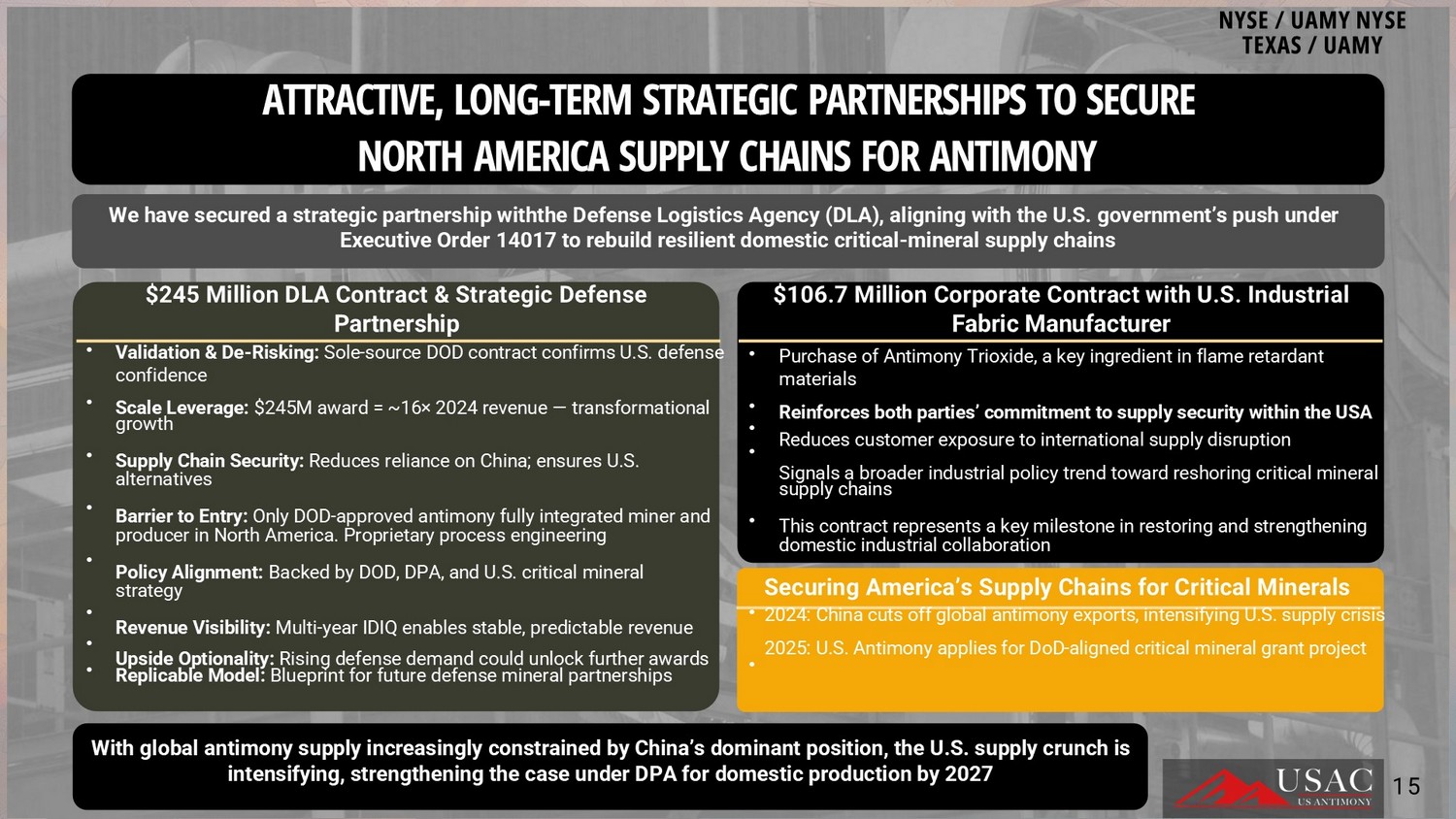 ATTRACTIVE, LONG - TERM STRATEGIC PARTNERSHIPS TO SECURE NORTH AMERICA SUPPLY CHAINS FOR ANTIMONY With global antimony supply increasingly constrained by China’s dominant position, the U.S. supply crunch is intensifying, strengthening the case under DPA for domestic production by 2027 We have secured a strategic partnership withthe Defense Logistics Agency (DLA), aligning with the U.S. government’s push unde r Executive Order 14017 to rebuild resilient domestic critical - mineral supply chains $245 Million DLA Contract & Strategic Defense Securing America’s Supply Chains for Critical Minerals 2024: China cuts off global antimony exports, intensifying U.S. supply crisis 2025: U.S. Antimony applies for DoD - aligned critical mineral grant project $106.7 Million Corporate Contract with U.S. Industrial 15 Partnership Fabric Manufacturer • • • • • • • • • • • • • • • Replicable Model: Blueprint for future defense mineral partnerships Validation & De - Risking: Sole - source DOD contract confirms U.S. defense confidence Scale Leverage: $245M award = ~16 × 2024 revenue — transformational growth Supply Chain Security: Reduces reliance on China; ensures U.S. alternatives Barrier to Entry: Only DOD - approved antimony fully integrated miner and producer in North America. Proprietary process engineering Policy Alignment: Backed by DOD, DPA, and U.S. critical mineral strategy Revenue Visibility: Multi - year IDIQ enables stable, predictable revenue Upside Optionality: Rising defense demand could unlock further awards Purchase of Antimony Trioxide, a key ingredient in flame retardant materials Reinforces both parties’ commitment to supply security within the USA Reduces customer exposure to international supply disruption Signals a broader industrial policy trend toward reshoring critical mineral supply chains This contract represents a key milestone in restoring and strengthening domestic industrial collaboration NYSE / UAMY NYSE TEXAS / UAMY
